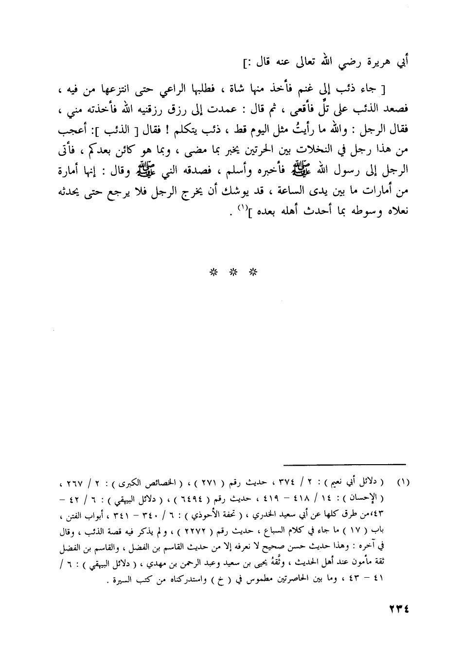 أبي هريرة رضي اللَّه تعالى عنه قال:] [جاء ذئب إلى غنم فأخذ منها شاة، فطلبها الراعي حتى انتزعها من فيه، فصعد الذئب على تلّ فأقعى، ثم قال: عمدت إلى رزق رزقنيه اللَّه فأخذته مني، فقال الرجل: واللَّه ما رأيت مثل اليوم قط، ذئب يتكلم! فقال [الذئب] : أعجب من هذا رجل في النخلات بين الحرتين يخبر بما مضى، وبما هو كائن بعدكم، فأتى الرجل إلى رسول اللَّه صلّى اللَّه عليه وسلّم فأخبره وأسلم، فصدقه النبي صلّى اللَّه عليه وسلّم وقال: إنها أمارة من أمارات ما بين يدي الساعة، قد يوشك أن يخرج الرجل فلا يرجع حتى يحدثه نعلاه وسوطه بما أحدث أهله بعده] [ (1) ] .