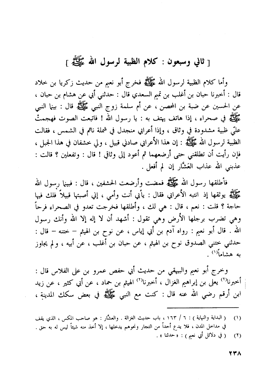 وأما كلام الظبية لرسول اللَّه صلّى اللَّه عليه وسلّم فخرج أبو نعيم من حديث زكريا بن خلاد قال: أخبرنا حبان بن أغلب بن تميم السعدي قال: حدثني أبي عن هشام بن حبان، عن الحسين عن ضبة بن المحصن، عن أم سلمة زوج النبي صلّى اللَّه عليه وسلّم قال: بينما النبي صلّى اللَّه عليه وسلّم في صحراء، إذا هاتف يهتف به: يا رسول اللَّه! فاتبعت الصوت فهجمت عليّ ظبية مشدودة في وثاق، وإذا أعرابي منجدل في شملة نائم في الشمس، فقالت الظبية لرسول اللَّه صلّى اللَّه عليه وسلّم: إن هذا الأعرابي صادني قبيل، ولي خشفان في هذا الجبل، فإن رأيت أن تطلقني حتى أرضعهما ثم أعود إلى وثاقي! قال: وتفعلين؟ قالت: