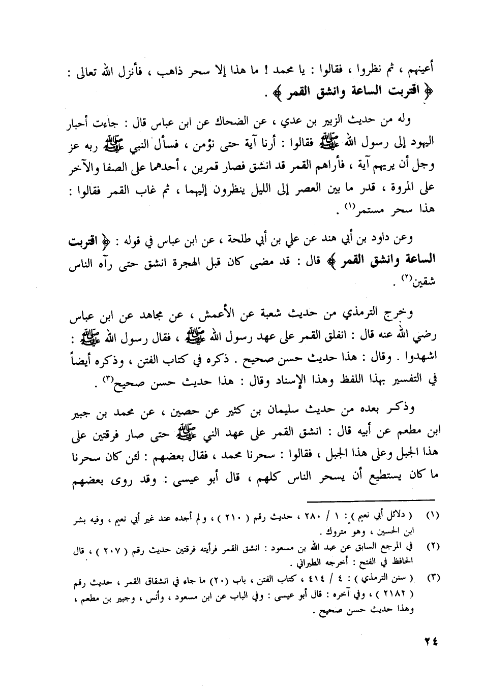 [ (2) ] في المرجع السابق عن عبد اللَّه بن مسعود: انشق القمر فرأيته فرقتين حديث رقم (207) ، قال الحافظ في الفتح: أخرجه الطبراني.