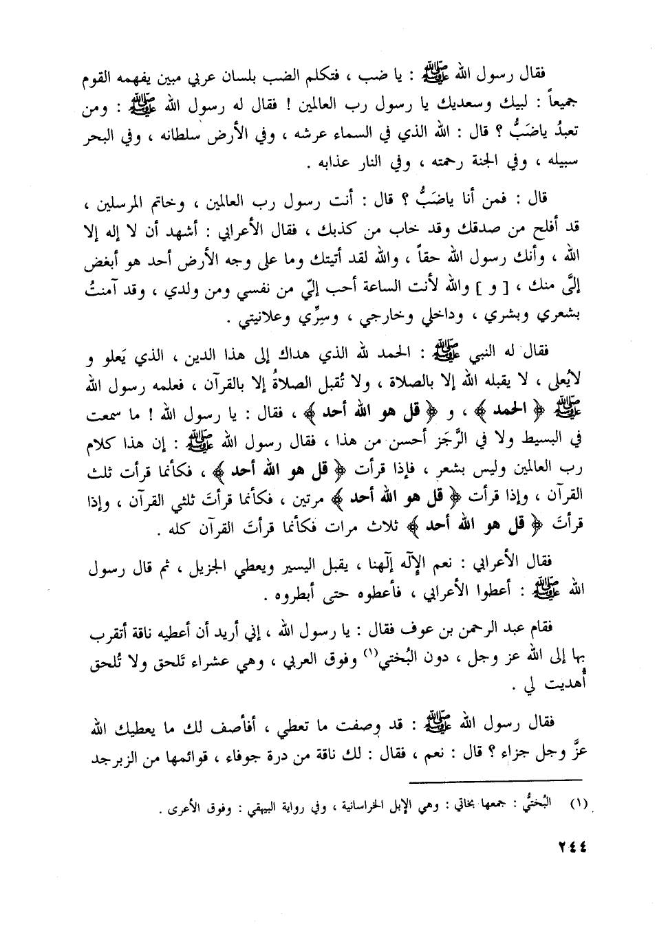 قال: فمن أنا يا ضبّ؟ قال: أنت رسول رب العالمين، وخاتم المرسلين، قد أفلح من صدقك وقد خاب من كذبك، فقال الأعرابي: أشهد أن لا إله إلا اللَّه، وأنك رسول اللَّه حقا، واللَّه لقد أتيتك وما على وجه الأرض أحد هو أبغض إليّ منك، [و] واللَّه لأنت الساعة أحب إليّ من نفسي ومن ولدي، وقد آمنت بشعري وبشري، وداخلي وخارجي، وسرّي وعلانيتي.
