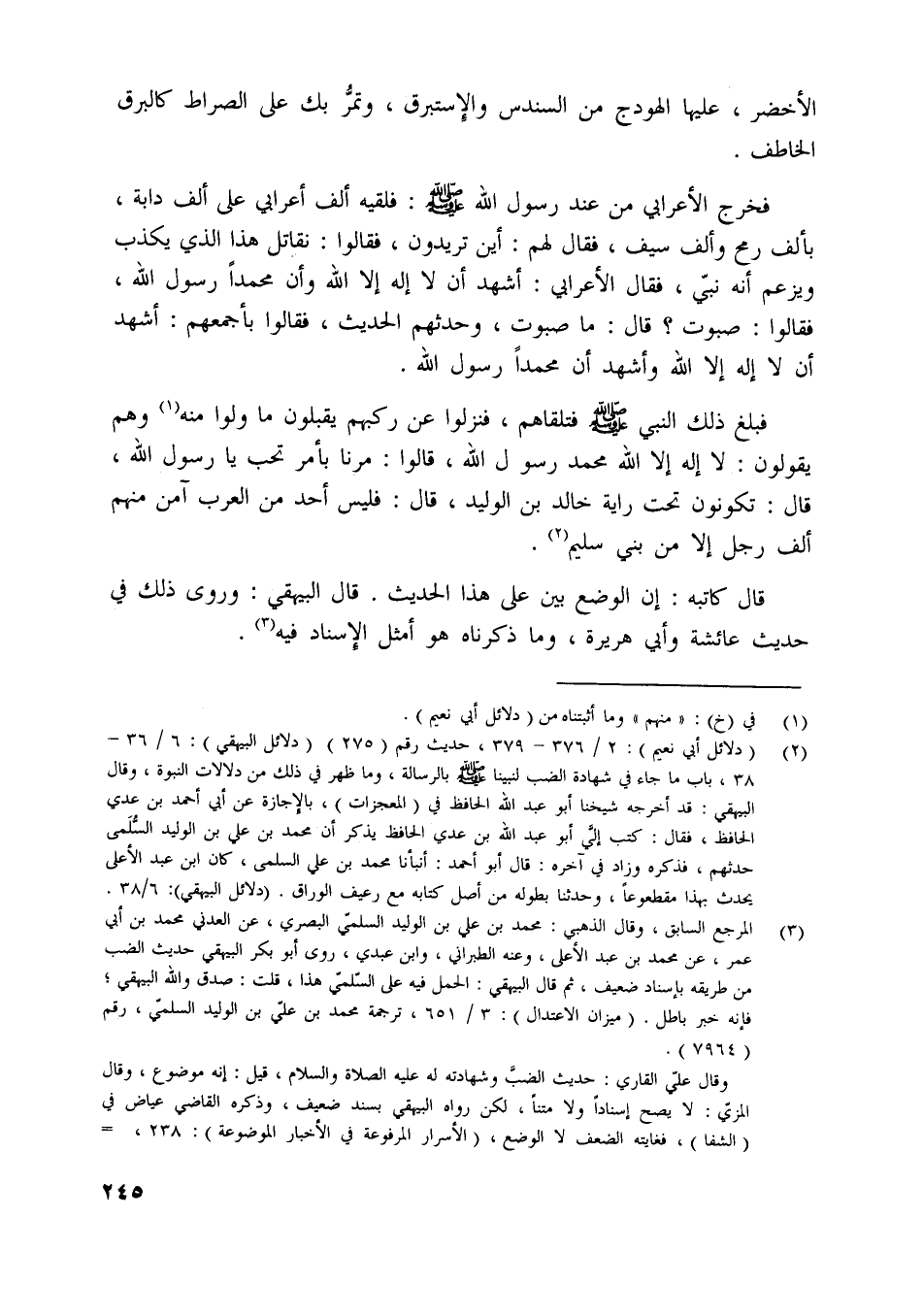 [ (2) ] (دلائل أبي نعيم) : 2/ 376- 379، حديث رقم (275) (دلائل البيهقي) : 6/ 36- 38، باب ما جاء في شهادة الضب لنبينا صلّى اللَّه عليه وسلّم بالرسالة، وما ظهر في ذلك من دلالات النبوة، وقال البيهقي: قد أخرجه شيخنا أبو عبد اللَّه الحافظ في (المعجزات) ، بالإجازة عن أبي أحمد بن عدي الحافظ، فقال: كتب إليّ أبو عبد اللَّه بن عدي الحافظ يذكر أن محمد بن علي بن الوليد السّلمى حدثهم، فذكره وزاد في آخره: قال أبو أحمد: أنبأنا محمد بن علي السلمي، كان ابن عبد الأعلى يحدث بهذا مقطوعا، وحدثنا بطوله من أصل كتابه مع رعيف الوراق. (دلائل البيهقي) : 6/ 38.
