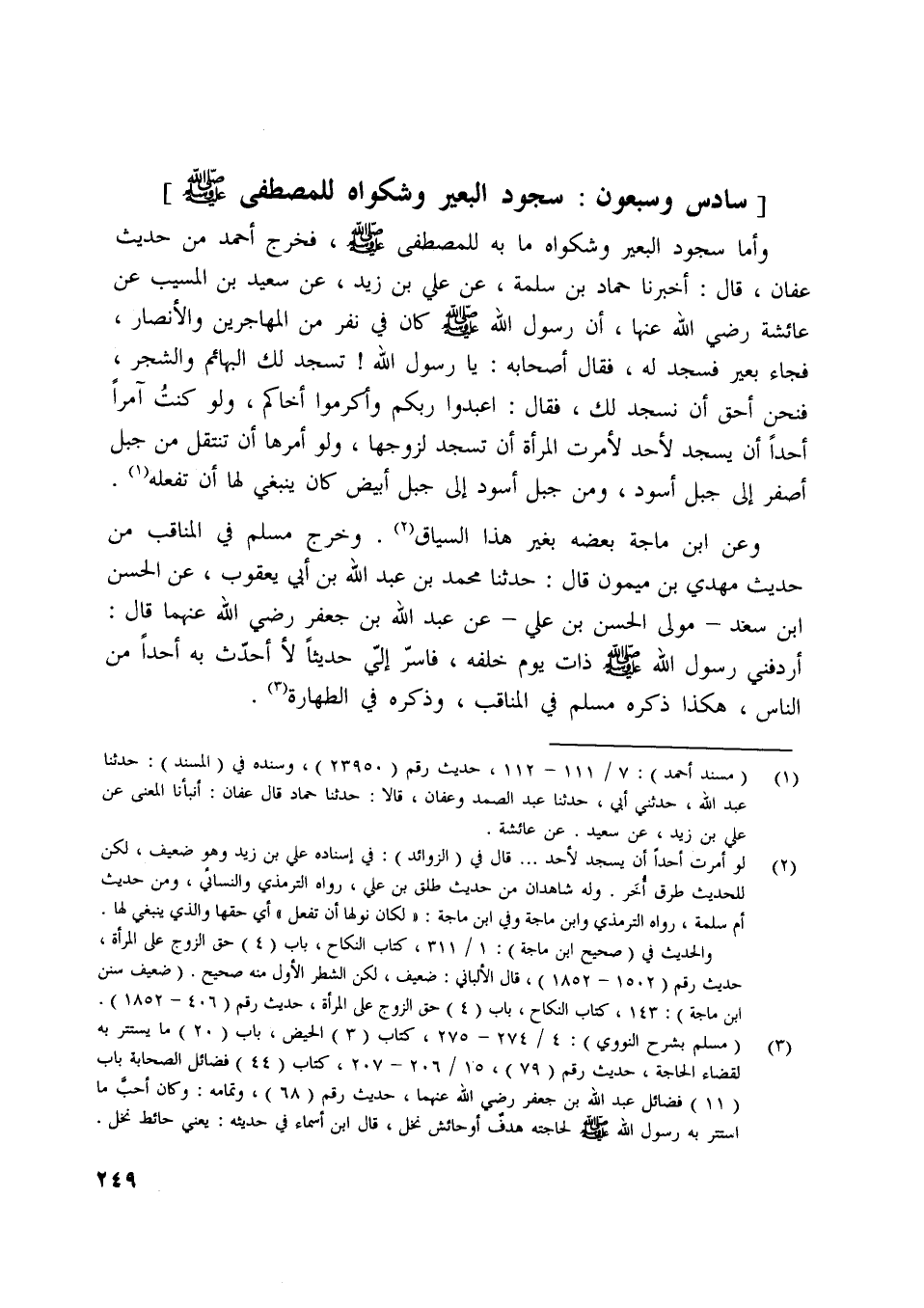 فخرج أحمد من حديث عفان، قال: أخبرنا حماد بن سلمة، عن علي بن زيد، عن سعيد بن المسيب عن عائشة رضي اللَّه عنها، أن رسول اللَّه صلّى اللَّه عليه وسلّم كان في نفر من المهاجرين والأنصار، فجاء بعير فسجد له، فقال أصحابه: يا رسول اللَّه! تسجد لك البهائم والشجر، فنحن أحق أن نسجد لك، فقال: اعبدوا ربكم وأكرموا أخاكم، ولو كنت آمرا أحدا أن يسجد لأحد لأمرت المرأة أن تسجد لزوجها، ولو أمرها أن تنتقل من جبل أصفر إلى جبل أسود، ومن جبل أسود إلى جبل أبيض كان ينبغي لها أن تفعله [ (1) ] .