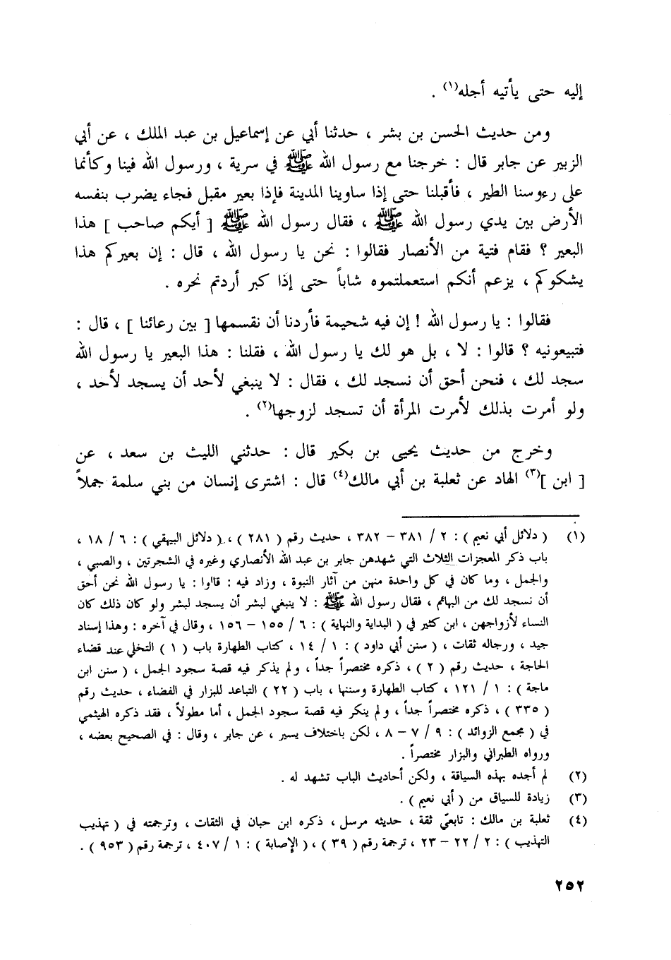 (دلائل أبي نعيم) : 2/ 381- 382، حديث رقم (281) ، (دلائل البيهقي) : 6/ 18، باب ذكر المعجزات الثلاث التي شهدهن جابر بن عبد اللَّه الأنصاري وغيره في الشجرتين، والصبي، والجمل، وما كان في كل واحدة منهن من آثار النبوة، وزاد فيه: قالوا: يا رسول اللَّه نحن أحق أن نسجد لك من البهائم، فقال رسول اللَّه صلّى اللَّه عليه وسلّم: لا ينبغي لبشر أن يسجد لبشر ولو كان ذلك كان النساء لأزواجهن،