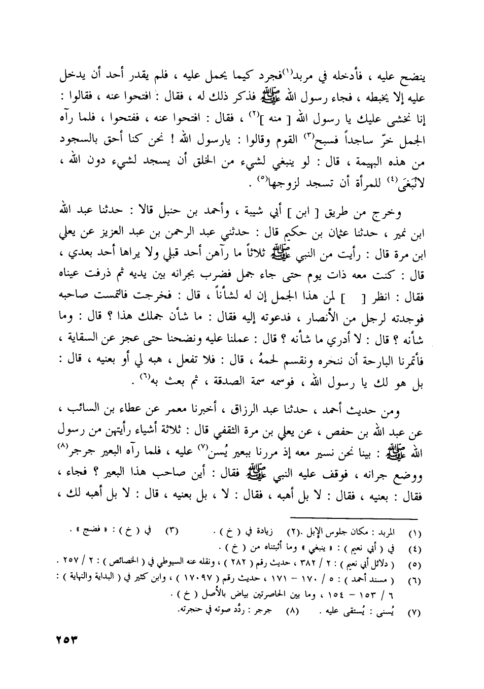 وخرج من طريق [ابن] أبي شيبة، وأحمد بن حنبل قالا: حدثنا عبد اللَّه ابن نمير، حدثنا عثمان بن حكيم قال: حدثني عبد الرحمن بن عبد العزيز عن يعلي ابن مرة قال: رأيت من النبي صلّى اللَّه عليه وسلّم ثلاثا ما رآهن أحد قبلي ولا يراها أحد بعدي، قال: كنت معه ذات يوم حتى جاء جمل فضرب بجرانه بين يديه ثم ذرفت عيناه فقال: انظر [] لمن هذا الجمل إن له لشأنا، قال: فخرجت فالتمست صاحبه فوجدته لرجل من الأنصار، فدعوته إليه فقال: ما شأن جملك هذا؟ قال: وما شأنه؟ قال: لا أدري ما شأنه؟ قال: عملنا عليه ونضحنا حتى عجز عن السقاية، فأتمرنا البارحة أن ننحره ونقسم لحمه، قال: فلا تفعل، هبه لي أو بعنيه، قال: