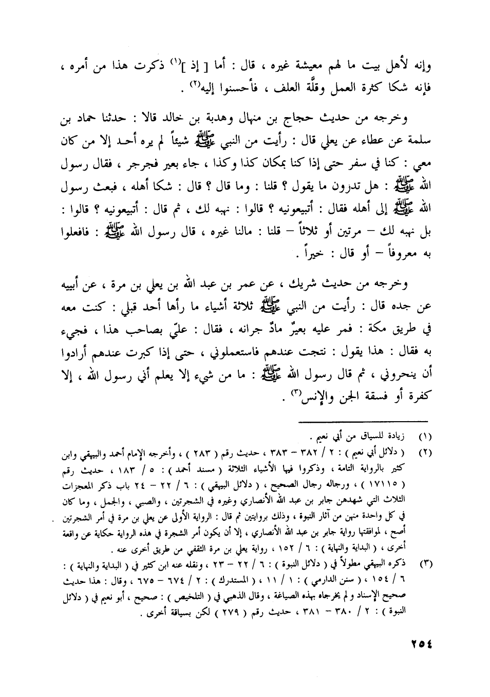 [ (2) ] (دلائل أبي نعيم) : 2/ 382- 383، حديث رقم (283) ، وأخرجه الإمام أحمد والبيهقي وابن كثير بالرواية التامة، وذكروا فيها الأشياء الثلاثة (مسند أحمد) : 5/ 183، حديث رقم (17115) ، ورجاله رجال الصحيح، (دلائل البيهقي) : 6/ 22- 24 باب ذكر المعجزات الثلاث التي شهدهن جابر بن عبد اللَّه الأنصاري وغيره في الشجرتين، والصبي، والجمل، وما كان في كل واحدة منهن من آثار النبوة، وذلك بروايتين ثم قال: الرواية الأولى عن يعلي بن مرة في أمر الشجرتين أصح، لموافقتها رواية جابر بن عبد اللَّه الأنصاري، إلا أن يكون أمر الشجرة في هذه الرواية حكاية عن واقعة أخرى، (البداية والنهاية) : 6/ 152، رواية يعلي بن مرة الثقفي من طريق أخرى عنه.