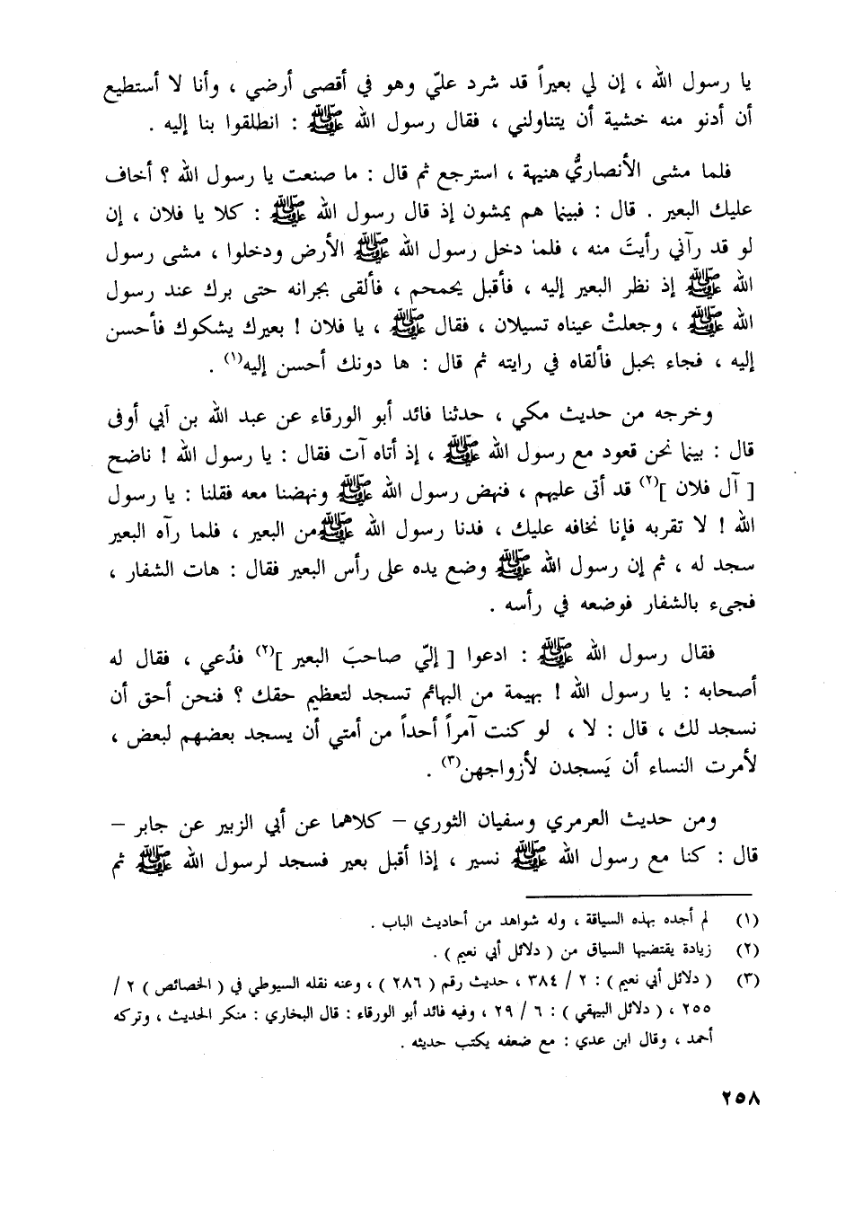 وخرجه من حديث مكي، حدثنا فائد أبو الورقاء عن عبد اللَّه بن أبي أوفى قال: بينما نحن قعود مع رسول اللَّه صلّى اللَّه عليه وسلّم، إذ أتاه آت فقال: يا رسول اللَّه! ناضح [آل فلان] [ (2) ] قد أتى عليهم، فنهض رسول اللَّه صلّى اللَّه عليه وسلّم ونهضنا معه فقلنا: يا رسول اللَّه! لا تقربه فإنا نخافه عليك، فدنا رسول اللَّه صلّى اللَّه عليه وسلّم من البعير، فلما رآه البعير سجد له، ثم إن رسول اللَّه صلّى اللَّه عليه وسلّم وضع يده على رأس البعير فقال: هات الشفار، فجيء بالشفار فوضعه في رأسه.