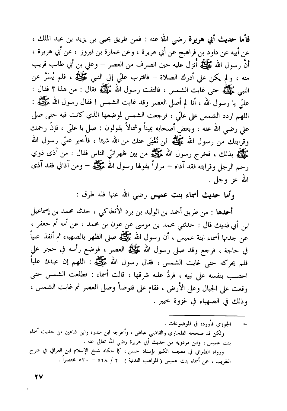 من طريق أحمد بن الوليد بن برد الأنطاكي، حدثنا محمد بن إسماعيل ابن أبي فديك قال: حدثني محمد بن موسى عن عون بن محمد، عن أمه أم جعفر، عن جدتها أسماء ابنة عميس، أن رسول اللَّه صلّى اللَّه عليه وسلم صلى الظهر بالصهباء ثم أنفذ عليا في حاجة، فرجع وقد صلى رسول اللَّه صلّى اللَّه عليه وسلم العصر، فوضع رأسه في حجر علي فلم يحركه حتى غابت الشمس، فقال رسول اللَّه صلّى اللَّه عليه وسلم: اللَّهمّ إن عبدك عليا احتسب بنفسه على نبيه، فردّ عليه شرقها، قالت أسماء: فطلعت الشمس حتى وقعت على الجبال وعلى الأرض، فقام على فتوضأ وصلى العصر ثم غابت الشمس، وذلك في الصهباء في غزوة خيبر.