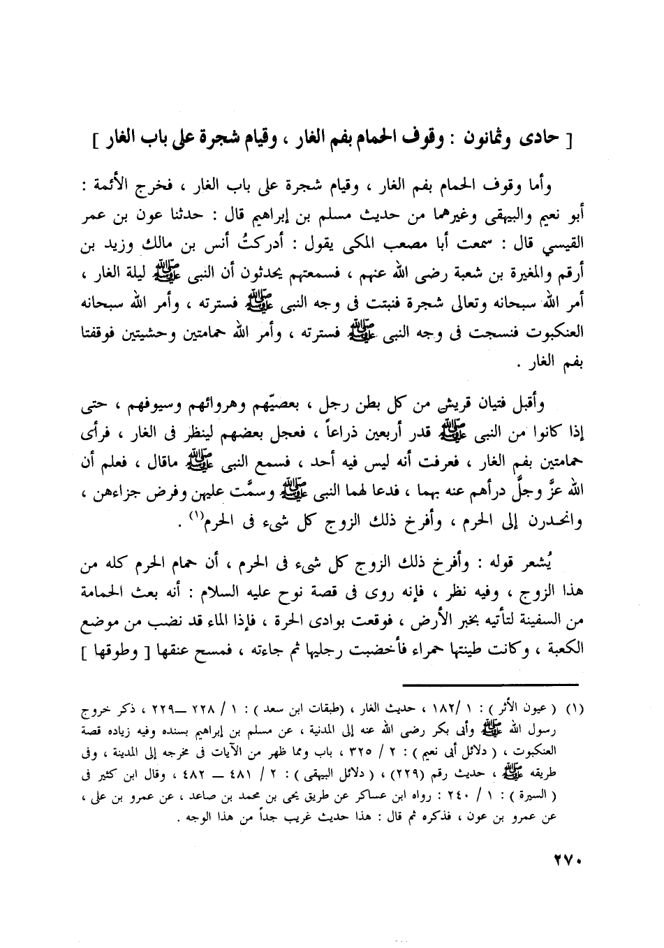 [ (1) ] (عيون الأثر) : 1/ 182، حديث الغار، (طبقات ابن سعد) : 1/ 228- 229، ذكر خروج رسول اللَّه صلّى اللَّه عليه وسلّم وأبى بكر رضي اللَّه عنه إلى المدينة، عن مسلم بن إبراهيم بسنده وفيه زيادة قصة العنكبوت، (دلائل أبي نعيم) : 2/ 325، باب ومما ظهر من الآيات في مخرجه إلى المدينة، وفي طريقه صلّى اللَّه عليه وسلّم، حديث رقم (229) ، (دلائل البيهقي) : 2/ 481- 482، وقال ابن كثير في (السيرة) : 1/ 240: رواه ابن عساكر عن طريق يحى بن محمد بن صاعد، عن عمرو بن على، عن عمرو بن عون، فذكره ثم قال: هذا حديث غريب جدا من هذا الوجه.