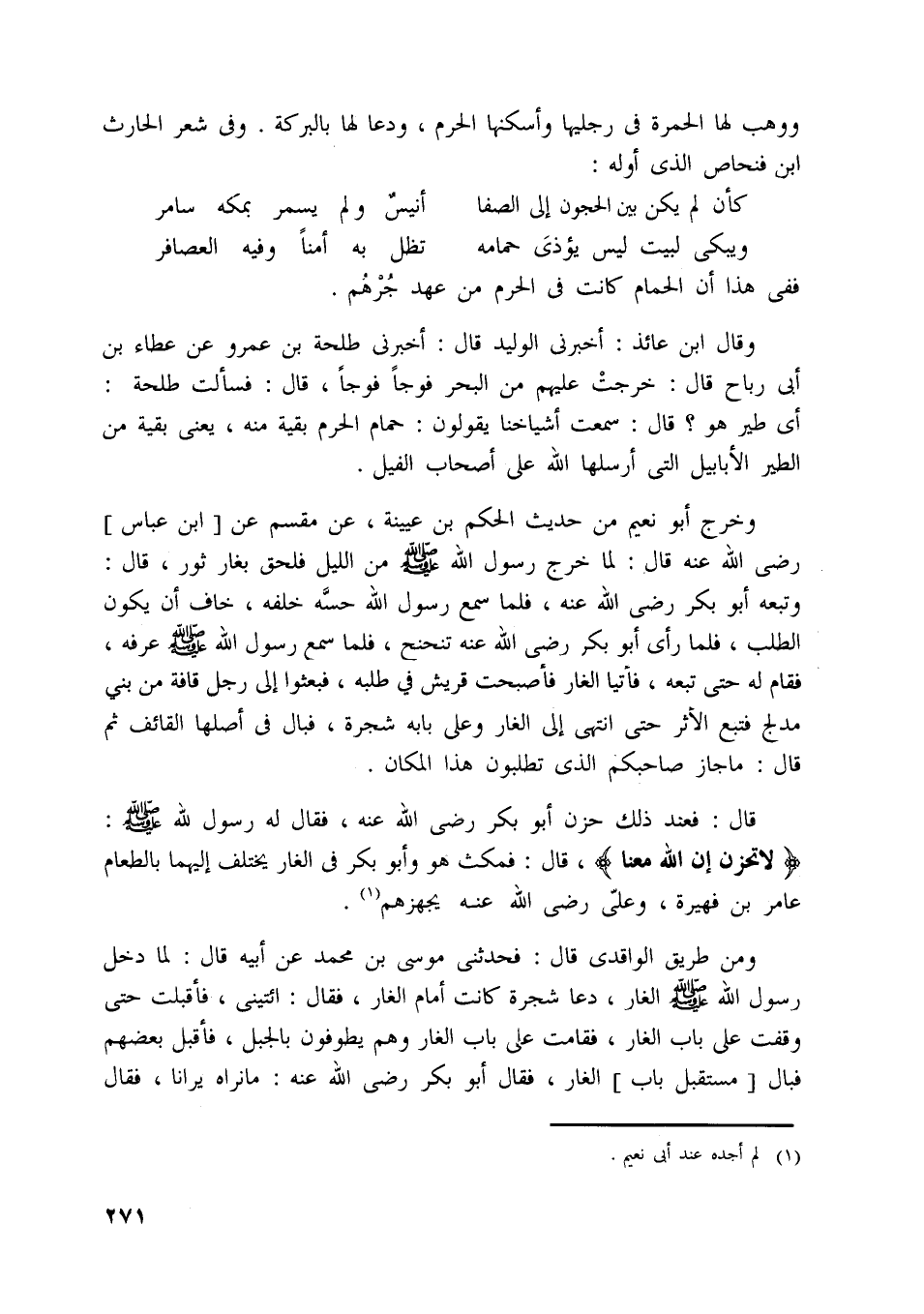 ومن طريق الواقدي قال: فحدثني موسى بن محمد عن أبيه قال: لما دخل رسول اللَّه صلّى اللَّه عليه وسلّم الغار، دعا شجرة كانت أمام الغار، فقال: ائتيني، فأقبلت حتى وقفت على باب الغار، فقامت على باب الغار وهم يطوفون بالجبل، فأقبل بعضهم فبال [مستقبل باب] الغار، فقال أبو بكر رضي اللَّه عنه: ما نراه يرانا، فقال