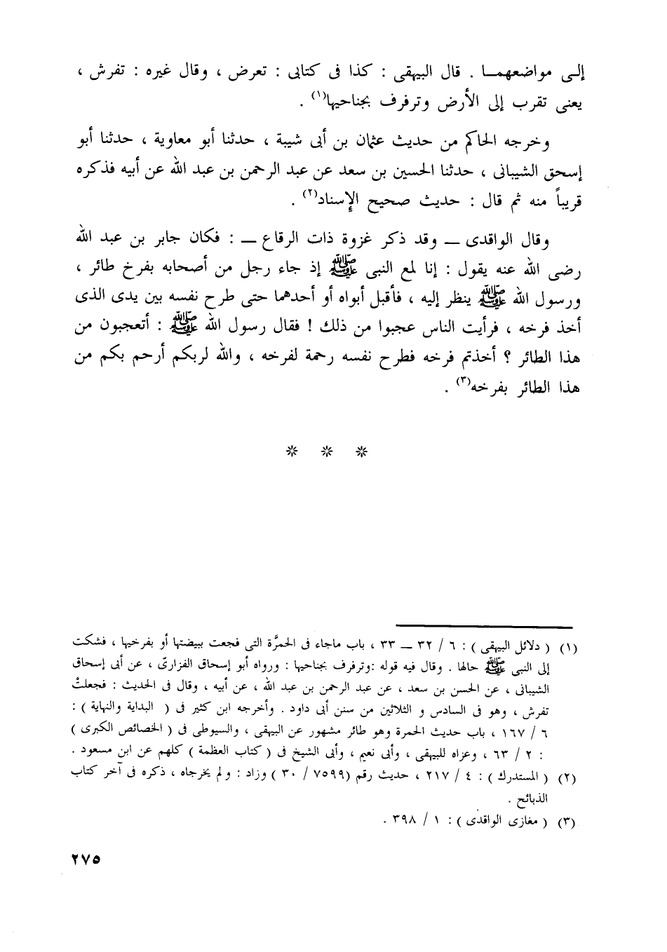 [ (1) ] (دلائل البيهقي) : 6/ 32- 33، باب ما جاء في الحمرة التي فجعت ببيضتها أو بفرخيها، فشكت إلى النبي صلّى اللَّه عليه وسلّم حالها. وقال فيه قوله: وترفرف بجناحيها: ورواه أبو إسحاق الفزارىّ، عن أبى إسحاق الشيباني، عن الحسن بن سعد، عن عبد الرحمن بن عبد اللَّه، عن أبيه، وقال في الحديث: فجعلت تفرش، وهو في السادس والثلاثين من سنن أبى داود. وأخرجه ابن كثير في (البداية والنهاية) :