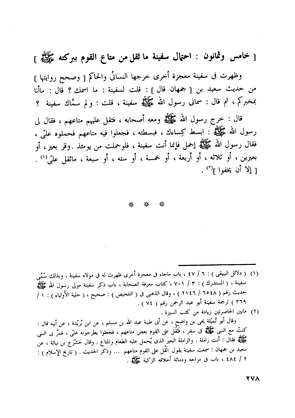 [ (1) ] (دلائل البيهقي) : 6/ 47، باب ما جاء في معجزة أخرى ظهرت له في مولاه سفينة، وبذلك سمّى سفينة، (المستدرك) : 3/ 701، كتاب معرفة الصحابة، باب ذكر سفينة مولى رسول اللَّه صلّى اللَّه عليه وسلّم حديث رقم (6548/ 2146) ، وقال الذهبي في (التلخيص) : صحيح، (حلية الأولياء) : 1/ 369) ترجمة سفينة أبو عبد الرحمن رقم (74) .