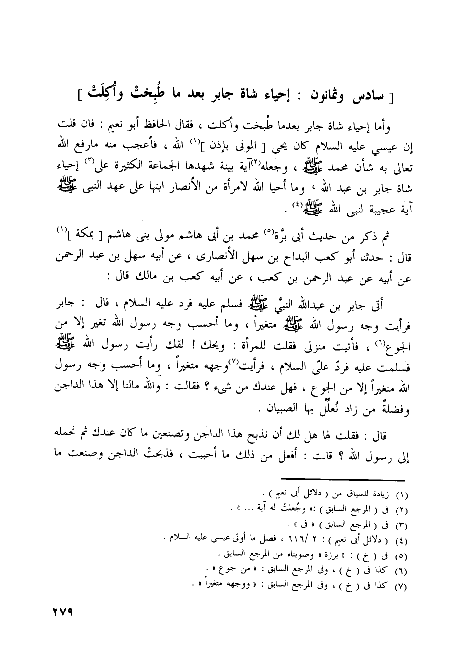 وأما إحياء شاة جابر بعد ما طبخت وأكلت، فقال الحافظ أبو نعيم: فان قلت إن عيسى عليه السلام كان يحى [الموتى بإذن] [ (1) ] اللَّه، فأعجب منه ما رفع اللَّه تعالى به شأن محمد صلّى اللَّه عليه وسلّم، وجعله [ (2) ] آية بينة شهدها الجماعة الكثيرة على [ (3) ] إحياء شاة جابر بن عبد اللَّه، وما أحيا اللَّه لامرأة من الأنصار ابنها على عهد النبي صلّى اللَّه عليه وسلّم آية عجيبة لنبي اللَّه صلّى اللَّه عليه وسلّم [ (4) ] .