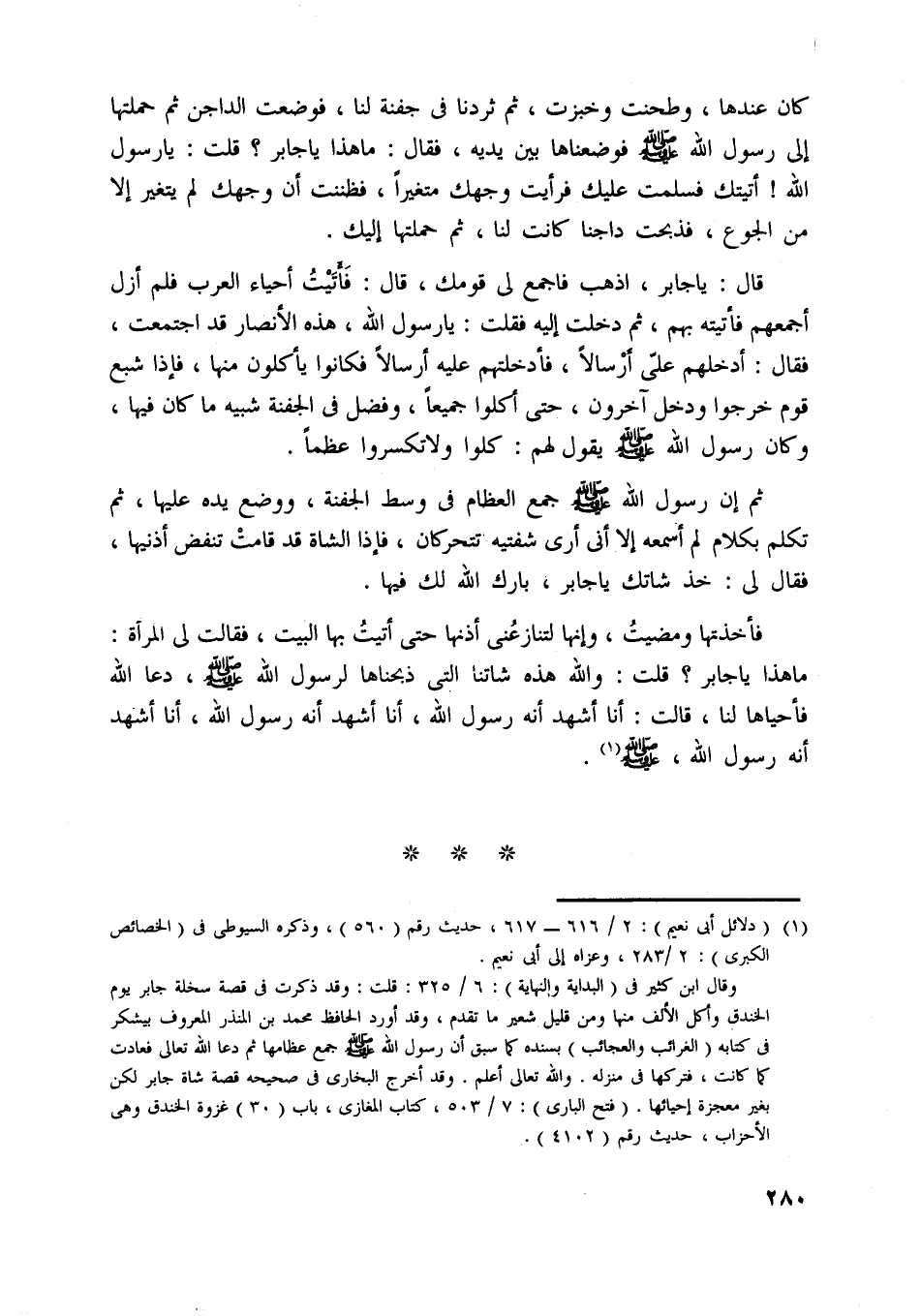 وقال ابن كثير في (البداية والنهاية) : 6/ 325: قلت: وقد ذكرت في قصة سخلة جابر يوم الخندق وأكل الألف منها ومن قليل شعير ما تقدم، وقد أورد الحافظ محمد بن المنذر المعروف بيشكر في كتابه (الغرائب والعجائب) بسنده كما سبق أن رسول اللَّه صلّى اللَّه عليه وسلّم جمع عظامها ثم دعا اللَّه تعالى فعادت كما كانت، فتركها في منزله. واللَّه تعالى أعلم. وقد أخرج البخاري في صحيحه قصة شاة جابر لكن بغير معجزة إحيائها. (فتح الباري) : 7/ 503، كتاب المغازي، باب (30) غزوة الخندق وهي الأحزاب، حديث رقم (4102) .