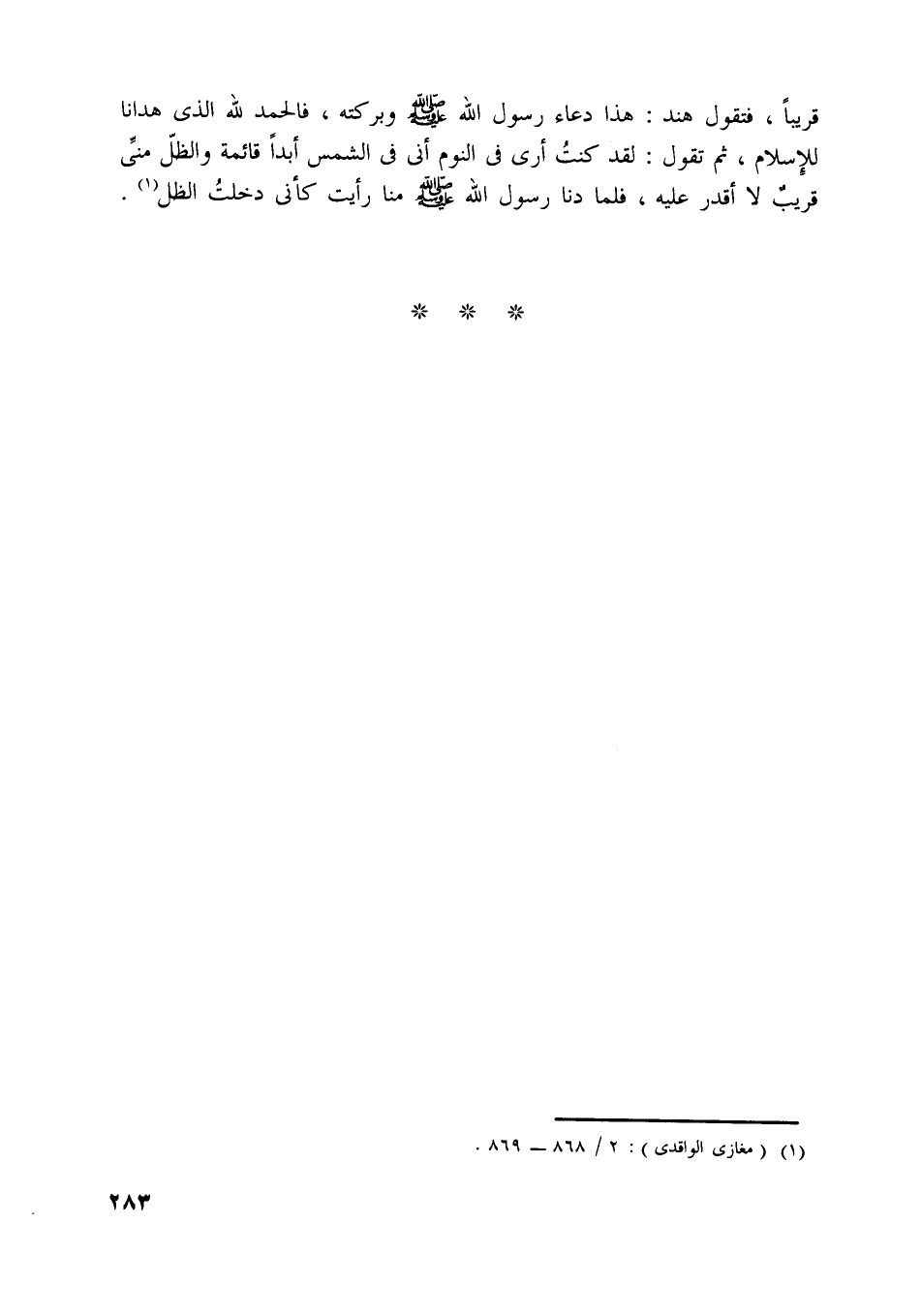 قريبا، فتقول هند: هذا دعاء رسول اللَّه صلّى اللَّه عليه وسلّم وبركته، فالحمد للَّه الّذي هدانا للإسلام، ثم تقول: لقد كنت أرى في النوم أنى في الشمس أبدا قائمة والظلّ منىّ قريب لا أقدر عليه، فلما دنا رسول اللَّه صلّى اللَّه عليه وسلّم منا رأيت كأنى دخلت الظل [ (1) ] .