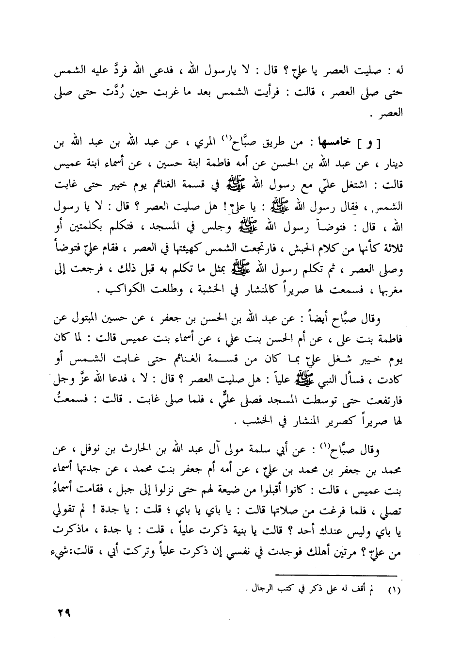 من طريق صبّاح [ (1) ] المري، عن عبد اللَّه بن عبد اللَّه بن دينار، عن عبد اللَّه بن الحسن عن أمه فاطمة ابنة حسين، عن أسماء ابنة عميس قالت: اشتغل عليّ مع رسول اللَّه صلّى اللَّه عليه وسلم في قسمة الغنائم يوم خيبر حتى غابت الشمس، فقال رسول اللَّه صلّى اللَّه عليه وسلم: يا عليّ! هل صليت العصر؟ قال: لا يا رسول اللَّه، قال: فتوضأ رسول اللَّه صلّى اللَّه عليه وسلم وجلس في المسجد، فتكلم بكلمتين أو ثلاثة كأنها من كلام الحبش، فارتجعت الشمس كهيئتها في العصر، فقام عليّ فتوضأ وصلى العصر، ثم تكلم رسول اللَّه صلّى اللَّه عليه وسلم بمثل ما تكلم به قبل ذلك، فرجعت إلى مغربها، فسمعت لها صريرا كالمنشار في الخشبة، وطلعت الكواكب.