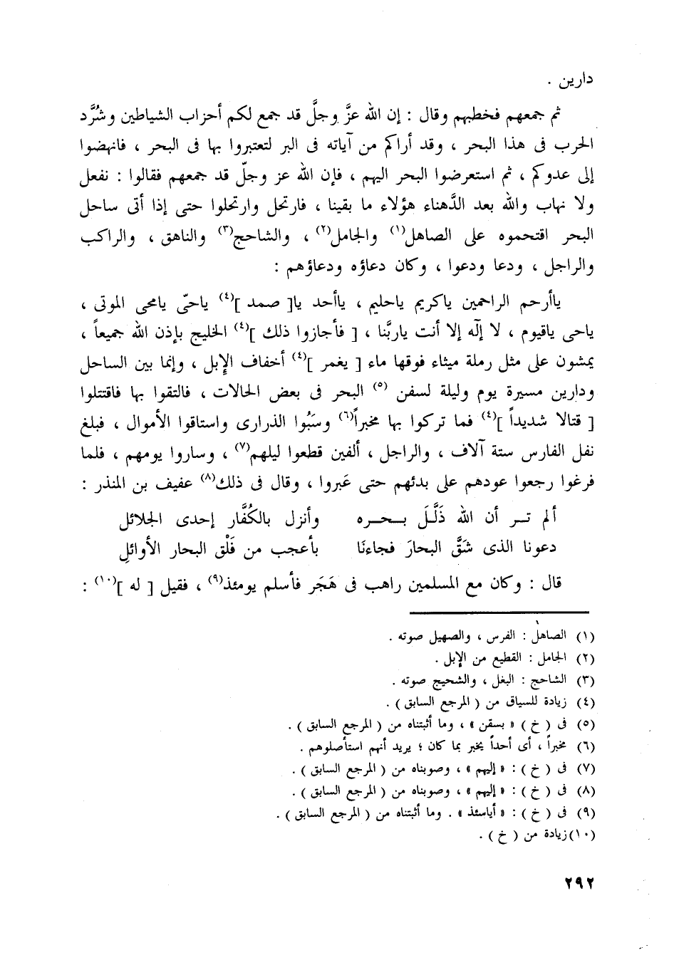 يا أرحم الراحمين يا كريم يا حليم، يا أحد يا [صمد] [ (4) ] يا حىّ يا محيي الموتى، يا حي يا قيوم، لا إله إلا أنت يا ربّنا، [فأجازوا ذلك] [ (4) ] الخليج بإذن اللَّه جميعا، يمشون على مثل رملة ميثاء فوقها ماء [يغمر] [ (4) ] أخفاف الإبل، وإنما بين الساحل ودارين مسيرة يوم وليلة لسفن [ (5) ] البحر في بعض الحالات، فالتقوا بها فاقتتلوا [قتالا شديدا] [ (4) ] فما تركوا بها مخبرا [ (6) ] وسبوا الذراري واستاقوا الأموال، فبلغ نفل الفارس ستة آلاف، والراجل، ألفين قطعوا ليلهم [ (7) ] ، وساروا يومهم، فلما فرغوا رجعوا عودهم على بدئهم حتى عبروا، وقال في ذلك [ (8) ] عفيف بن المنذر:
