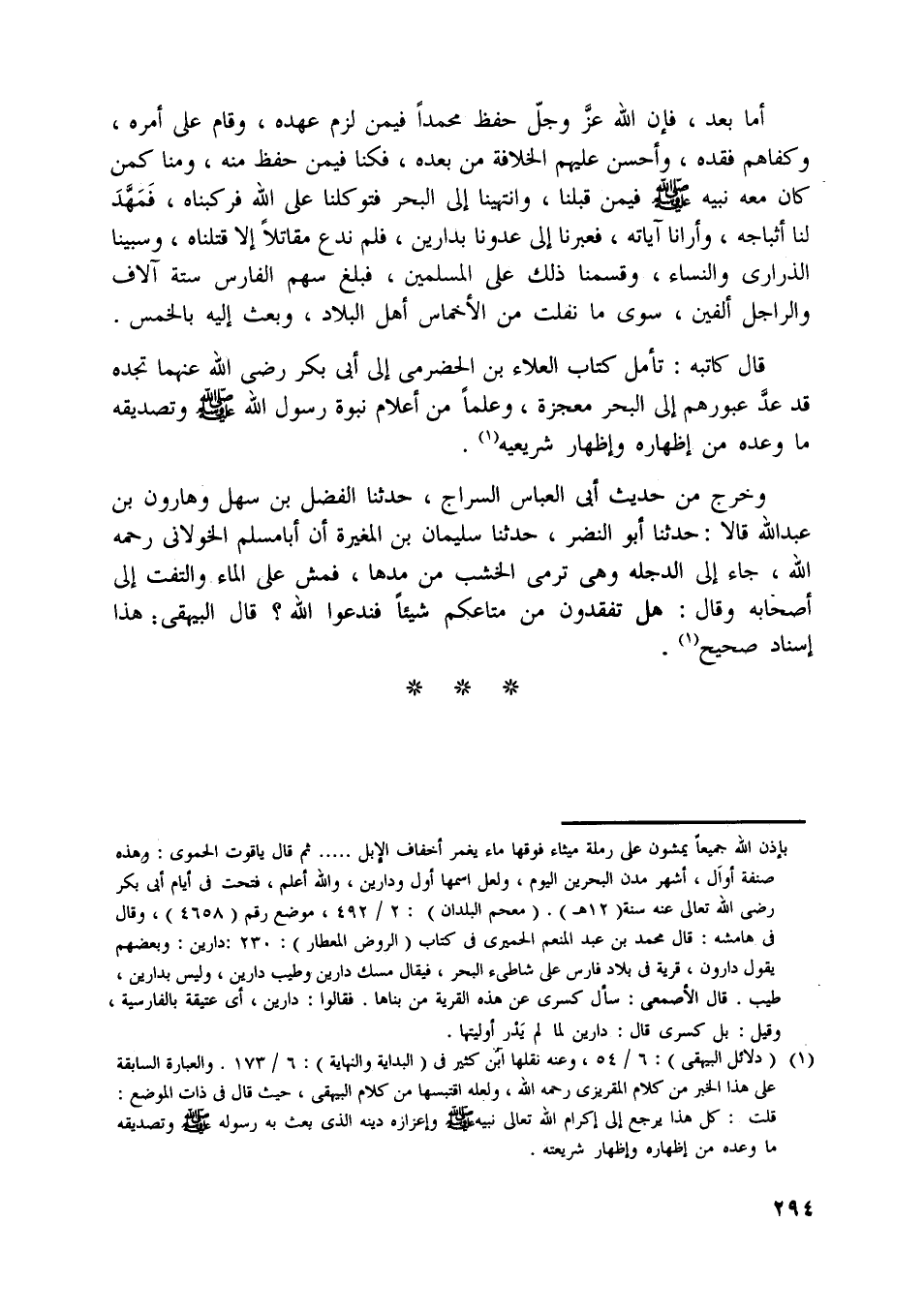 قال كاتبه: تأمل كتاب العلاء بن الحضرميّ إلى أبى بكر رضي اللَّه عنهما تجده قد عدّ عبورهم إلى البحر معجزة، وعلما من أعلام نبوة رسول اللَّه صلّى اللَّه عليه وسلّم وتصديقه ما وعده من إظهاره وإظهار شريعيه [ (1) ] .