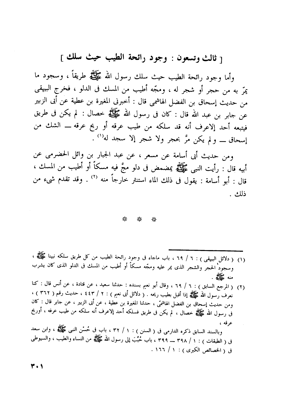 [ (1) ] (دلائل البيهقي) : 6/ 69، باب ما جاء في وجود رائحة الطيب من كل طريق سلكه نبينا صلّى اللَّه عليه وسلّم، وسجود الحجر والشجر الّذي يمر عليه ومجّه مسكا أو أطيب من المسك في الدلو الّذي كان يشرب منه صلّى اللَّه عليه وسلّم.