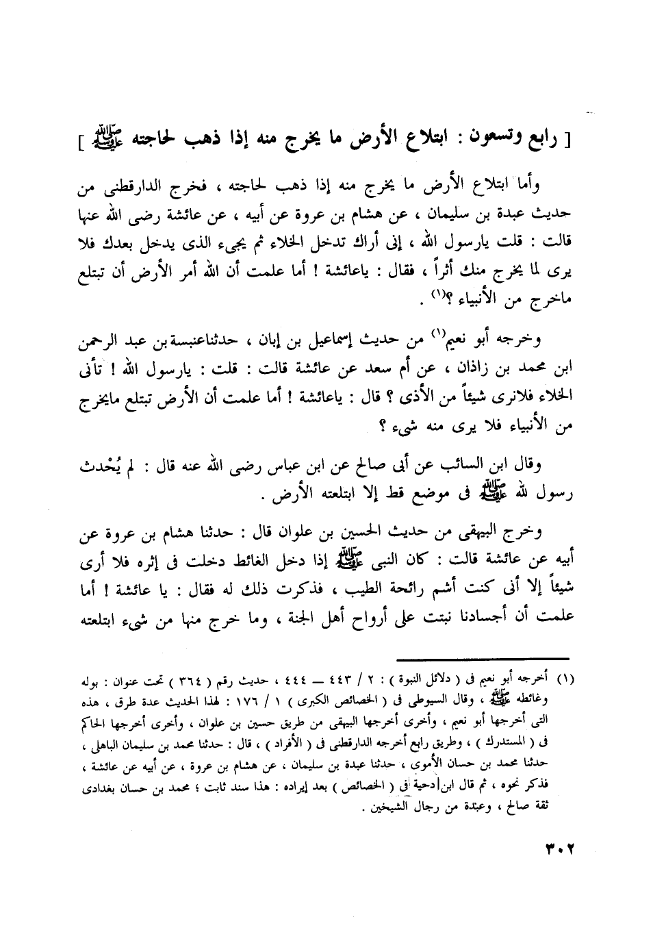 فخرج الدار قطنى من حديث عبدة بن سليمان، عن هشام بن عروة عن أبيه، عن عائشة رضي اللَّه عنها قالت: قلت يا رسول اللَّه، إني أراك تدخل الخلاء ثم يجيء الّذي يدخل بعدك فلا يرى لما يخرج منك أثرا، فقال: يا عائشة! أما علمت أن اللَّه أمر الأرض أن تبتلع ما خرج من الأنبياء؟ [ (1) ] .