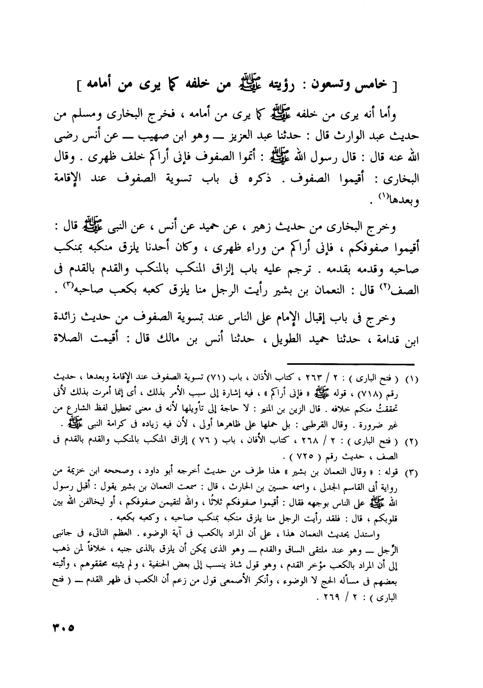 [ (2) ] (فتح الباري) : 2/ 268، كتاب الأذان، باب (76) إلزاق المنكب بالمنكب والقدم بالقدم في الصف، حديث رقم (725) .