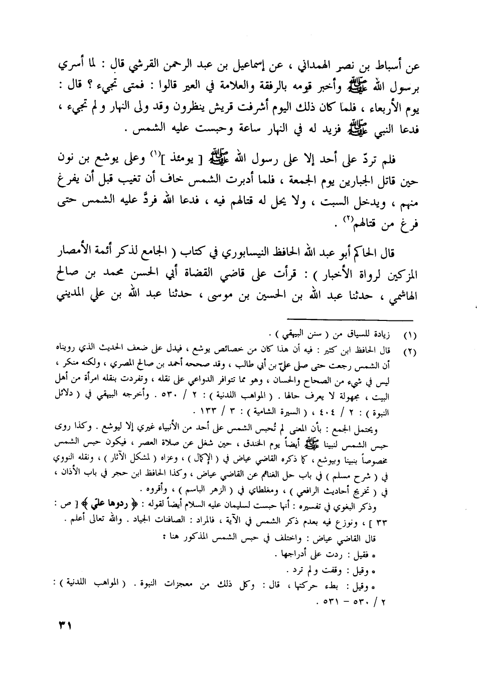 [ (2) ] قال الحافظ ابن كثير: فيه أن هذا كان من خصائص يوشع، فيدل على ضعف الحديث الّذي رويناه أن الشمس رجعت حتى صلى عليّ بن أبي طالب، وقد صححه أحمد بن صالح المصري، ولكنه منكر، ليس في شيء من الصحاح والحسان، وهو مما تتوافر الدواعي على نقله، وتفردت بنقله امرأة من أهل البيت، مجهولة لا يعرف حالها. (المواهب اللدنية) : 2/ 530. وأخرجه البيهقي في (دلائل النبوة) : 2/ 404، (السيرة الشامية) : 3/ 133.