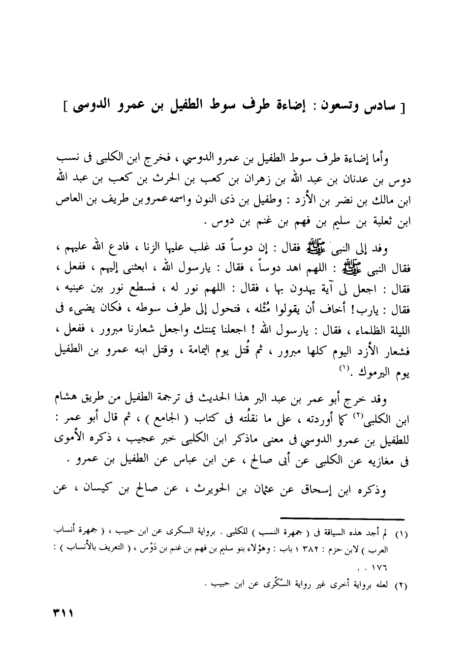 وقد خرج أبو عمر بن عبد البر هذا الحديث في ترجمة الطفيل من طريق هشام ابن الكلبي [ (2) ] كما أوردته، على ما نقلته في كتاب (الجامع) ، ثم قال أبو عمر: