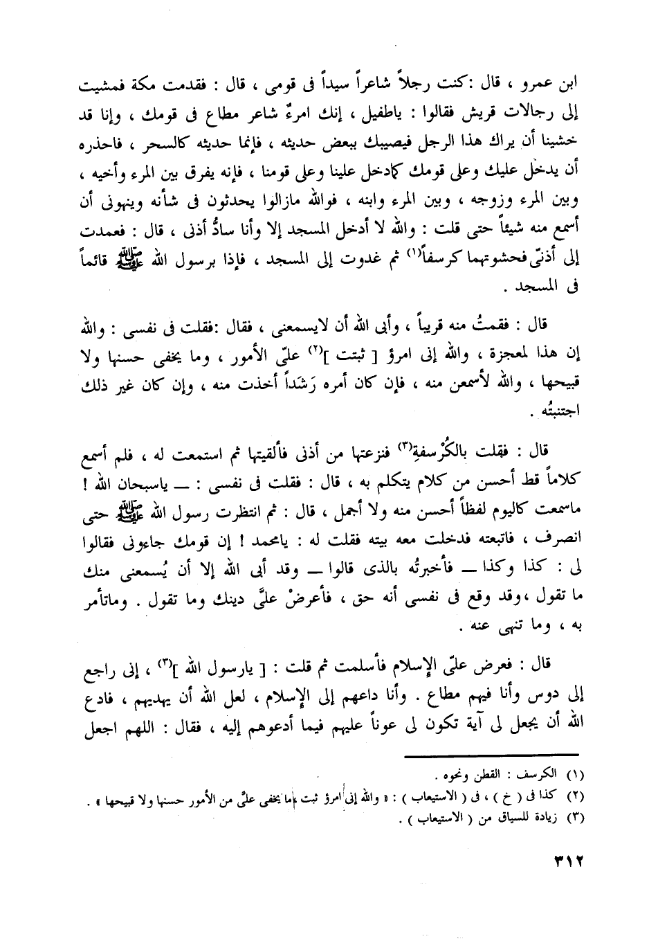 ابن عمرو، قال: كنت رجلا شاعرا سيدا في قومي، قال: فقدمت مكة فمشيت إلى رجالات قريش فقالوا: يا طفيل، إنك امرؤ شاعر مطاع في قومك، وإنا قد خشينا أن يراك هذا الرجل فيصيبك ببعض حديثه، فإنما حديثه كالسحر، فاحذره أن يدخل عليك وعلى قومك كما دخل علينا وعلى قومنا، فإنه يفرق بين المرء وأخيه، وبين المرء وزوجه، وبين المرء وابنه، فو اللَّه ما زالوا يحدثون في شأنه وينهوني أن أسمع منه شيئا حتى قلت: واللَّه لا أدخل المسجد إلا وأنا سادّ أذنى، قال: فعمدت إلى أذني فحشوتهما كرسفا [ (1) ] ثم غدوت إلى المسجد، فإذا برسول اللَّه صلّى اللَّه عليه وسلّم قائما في المسجد.