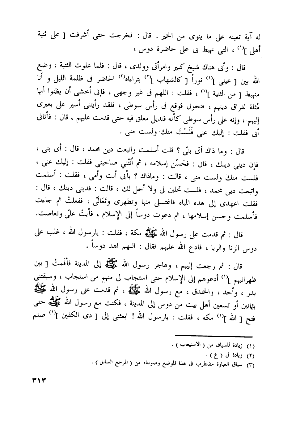 قال: ثم رجعت إليهم، وهاجر رسول اللَّه صلّى اللَّه عليه وسلّم إلى المدينة فأقمت [بين ظهرانيهم] [ (1) ] أدعوهم إلى الإسلام حتى استجاب لي منهم من استجاب، وسبقتني بدر، وأحد، والخندق، مع رسول اللَّه صلّى اللَّه عليه وسلّم، ثم قدمت على رسول اللَّه صلّى اللَّه عليه وسلّم بثمانين أو تسعين أهل بيت من دوس إلى المدينة، فكنت مع رسول اللَّه صلّى اللَّه عليه وسلّم حتى فتح [اللَّه] [ (1) ] مكة،