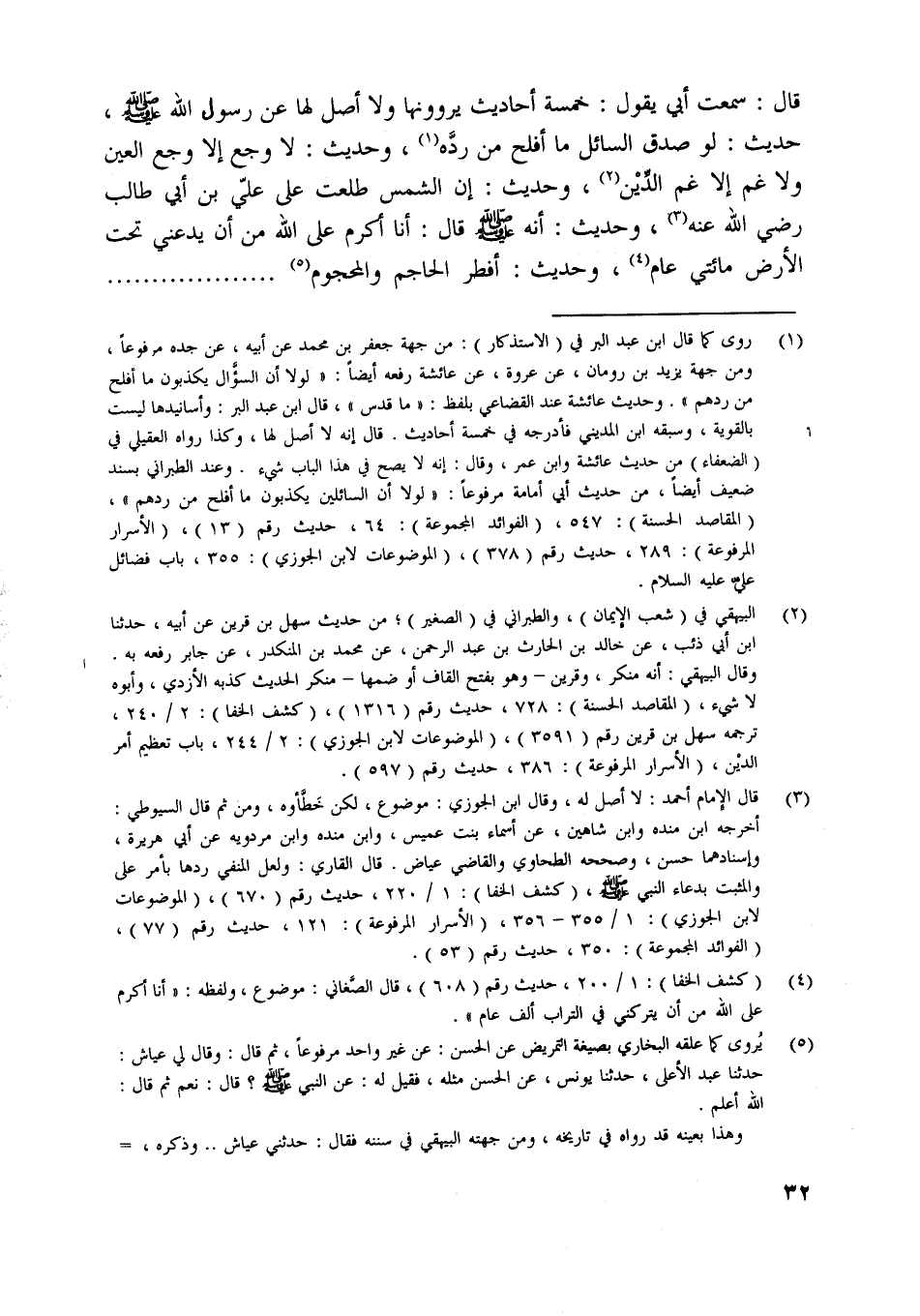 قال: سمعت أبي يقول: خمسة أحاديث يروونها ولا أصل لها عن رسول اللَّه صلّى اللَّه عليه وسلم، حديث: لو صدق السائل ما أفلح من ردّه [ (1) ] ، وحديث: لا وجع إلا وجع العين ولا غم إلا غم الدّين [ (2) ] ، وحديث: إن الشمس طلعت على عليّ بن أبي طالب رضي اللَّه عنه [ (3) ] ، وحديث: