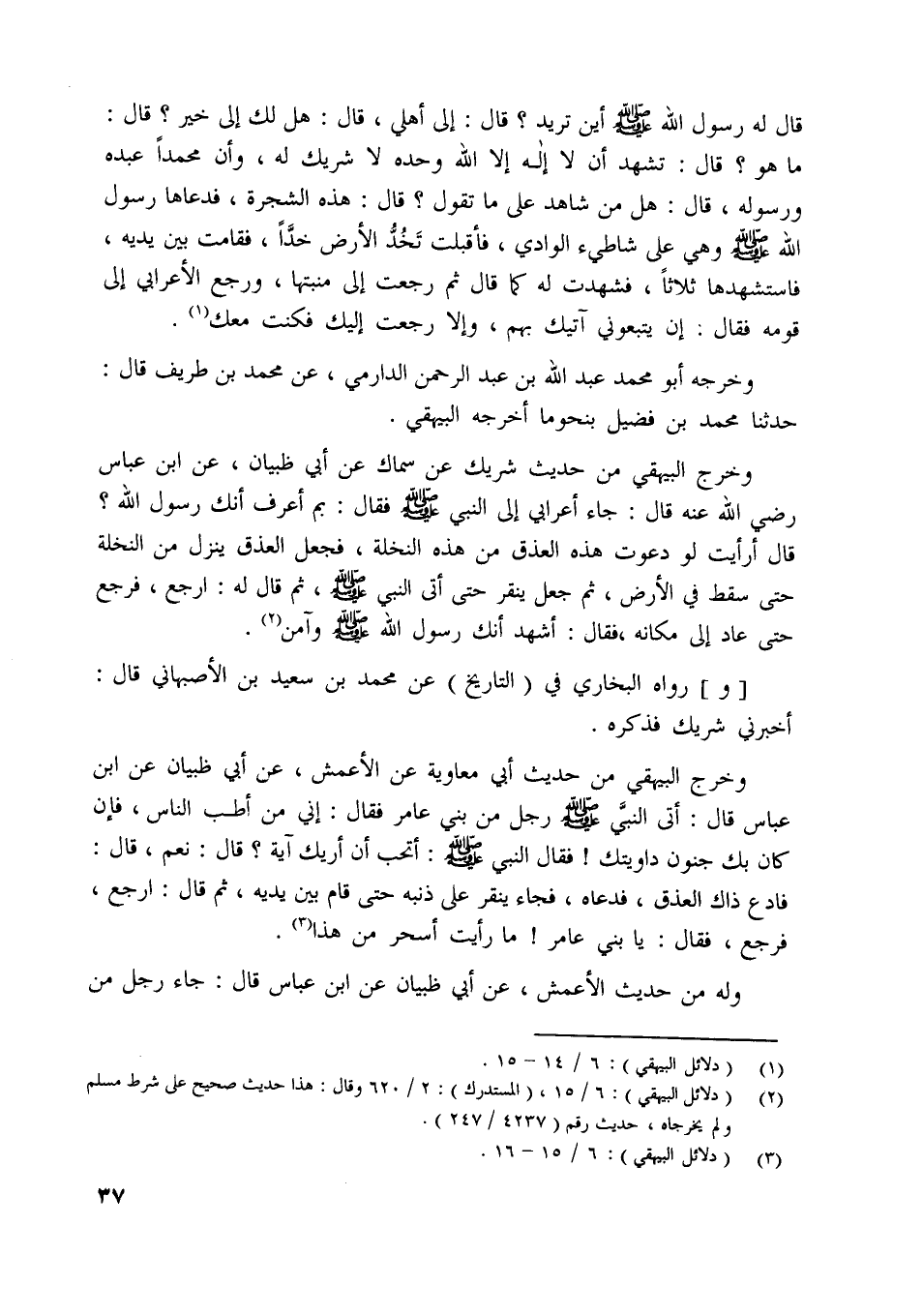 قال أرأيت لو دعوت هذه العذق من هذه النخلة، فجعل العذق ينزل من النخلة حتى سقط في الأرض، ثم جعل ينقر حتى أتى النبي صلّى اللَّه عليه وسلم، ثم قال له: ارجع، فرجع حتى عاد إلى مكانه، فقال: أشهد أنك رسول اللَّه صلّى اللَّه عليه وسلم وآمن [ (2) ] .