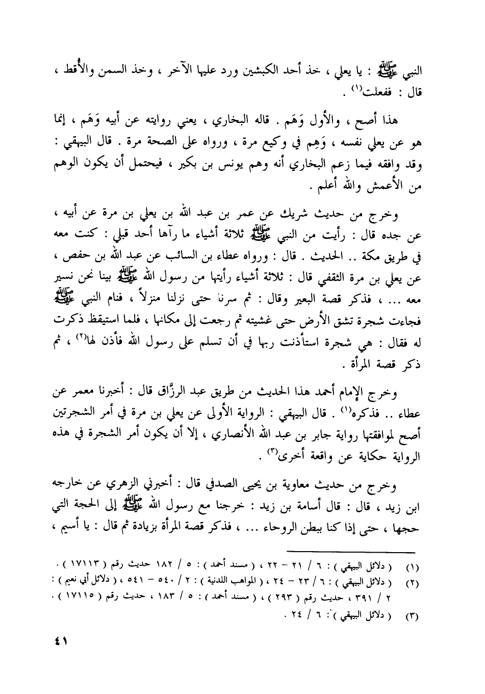 وخرج الإمام أحمد هذا الحديث من طريق عبد الرزّاق قال: أخبرنا معمر عن عطاء.. فذكره [ (1) ] . قال البيهقي: الرواية الأولى عن يعلي بن مرة في أمر الشجرتين أصح لموافقتها رواية جابر بن عبد اللَّه الأنصاري، إلا أن يكون أمر الشجرة في هذه.