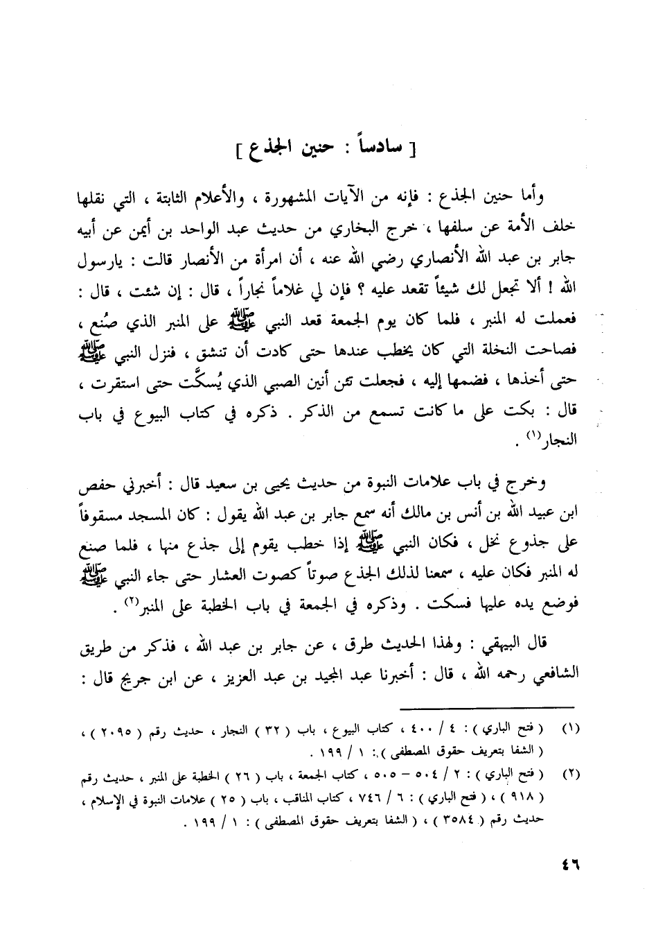 [ (2) ] (فتح الباري) : 2/ 504- 505، كتاب الجمعة، باب (26) الخطبة على المنبر، حديث رقم (918) ، (فتح الباري) : 6/ 746، كتاب المناقب، باب (25) علامات النبوة في الإسلام، حديث رقم (3584) ، (الشفا بتعريف حقوق المصطفى) : 1/ 199.