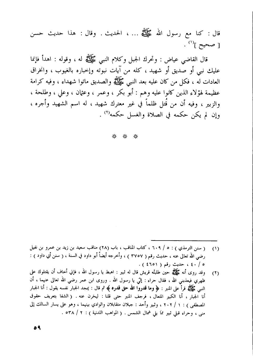 قال القاضي عياض: وتحرك الجبل وكلام النبي صلّى اللَّه عليه وسلم له، وقوله: اهدأ فإنما عليك نبي أو صديق أو شهيد، كله من آيات نبوته وإخباره بالغيوب، وانخراق العادات له، فكل من كان عليه بعد النبي صلّى اللَّه عليه وسلم والصديق ماتوا شهداء، وفيه كرامة عظيمة لهؤلاء الذين كانوا عليه وهم: أبو بكر، وعمر، وعثمان، وعلي، وطلحة، والزبير، وفيه أن من قتل ظلما في غير معترك شهيد، له اسم الشهيد وأجره، وإن لم يكن حكمه في الصلاة والغسل حكمه [ (2) ] .
