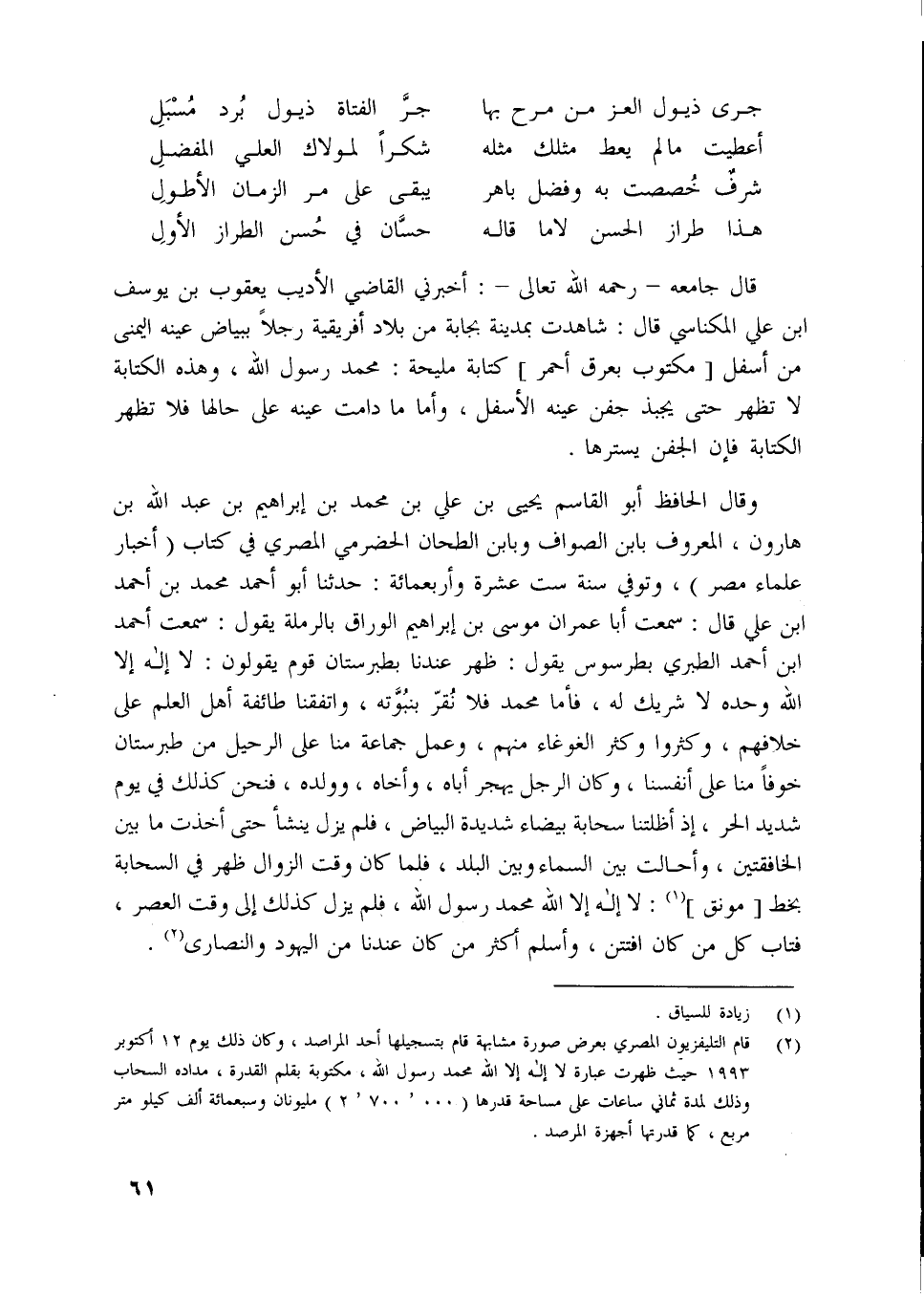 وقال الحافظ أبو القاسم يحيى بن علي بن محمد بن إبراهيم بن عبد اللَّه بن هارون، المعروف بابن الصواف وبابن الطحان الحضرميّ المصري في كتاب (أخبار علماء مصر) ، وتوفي سنة ست عشرة وأربعمائة: حدثنا أبو أحمد محمد بن أحمد ابن علي قال: سمعت أبا عمران موسى بن إبراهيم الوراق بالرملة يقول: سمعت أحمد ابن أحمد الطبري بطرسوس يقول: ظهر عندنا بطبرستان قوم يقولون: لا إله إلا اللَّه وحده لا شريك له، فأما محمد فلا نقرّ بنبوّته، واتفقنا طائفة أهل العلم على خلافهم، وكثروا وكثر الغوغاء منهم، وعمل جماعة منا على الرحيل من طبرستان خوفا منا على أنفسنا، وكان الرجل يهجر أباه، وأخاه، وولده، فنحن كذلك في يوم شديد الحر، إذ أظلتنا سحابة بيضاء شديدة البياض، فلم يزل ينشأ حتى أخذت ما بين الخافقتين، وأحالت بين السماء وبين البلد، فلما كان وقت الزوال ظهر في السحابة بخط [مونق] [ (1) ] : لا إله إلا اللَّه محمد رسول اللَّه، فلم يزل كذلك إلى وقت العصر، فتاب كل من كان افتتن، وأسلم أكثر من كان عندنا من اليهود والنصارى [ (2) ] .