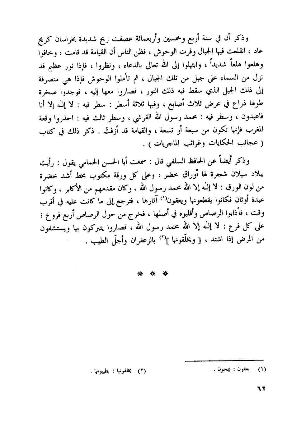 وذكر أن في سنة أربع وخمسين وأربعمائة عصفت ريح شديدة بخراسان كريح عاد، انقلعت فيها الجبال وفرت الوحوش، فظن الناس أن القيامة قد قامت، وخافوا وهلعوا هلعا شديدا، وابتهلوا إلى اللَّه تعالى بالدعاء، ونظروا، فإذا نور عظيم قد نزل من السماء على جبل من تلك الجبال، ثم تأملوا الوحوش فإذا هي منصرفة إلى ذلك الجبل الّذي سقط فيه ذلك النور، فصاروا معها إليه، فوجدوا صخرة طولها ذراع في عرض ثلاث أصابع، وفيها ثلاثة أسطر: سطر فيه: لا إله إلا أنا فاعبدون، وسطر فيه: محمد رسول اللَّه القرشي، وسطر ثالث فيه: احذروا وقعة المغرب فإنّها تكون من سبعة أو تسعة، والقيامة قد أزفت. ذكر ذلك في كتاب (عجائب الحكايات وغرائب الماجريات) .