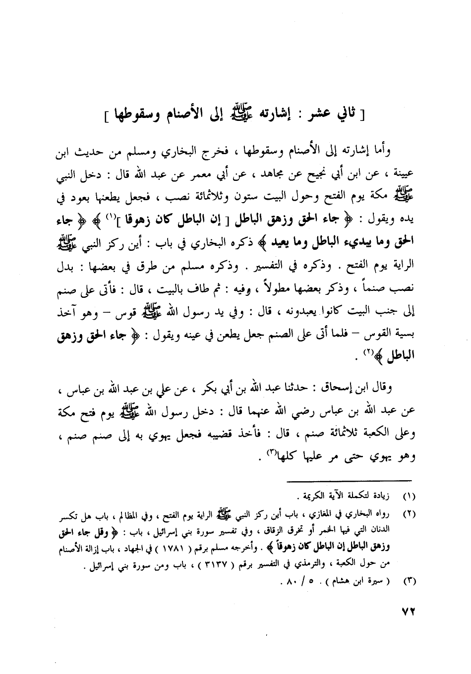 [ (2) ] رواه البخاري في المغازي، باب أين ركز النبي صلّى اللَّه عليه وسلم الراية يوم الفتح، وفي المظالم، باب هل تكسر الدنان التي فيها الخمر أو تخرق الزقاق، وفي تفسير سورة بني إسرائيل، باب: وَقُلْ جاءَ الْحَقُّ وَزَهَقَ الْباطِلُ إِنَّ الْباطِلَ كانَ زَهُوقاً. وأخرجه مسلم برقم (1781) في الجهاد، باب إزالة الأصنام من حول الكعبة، والترمذي في التفسير برقم (3137) ، باب ومن سورة بني إسرائيل.