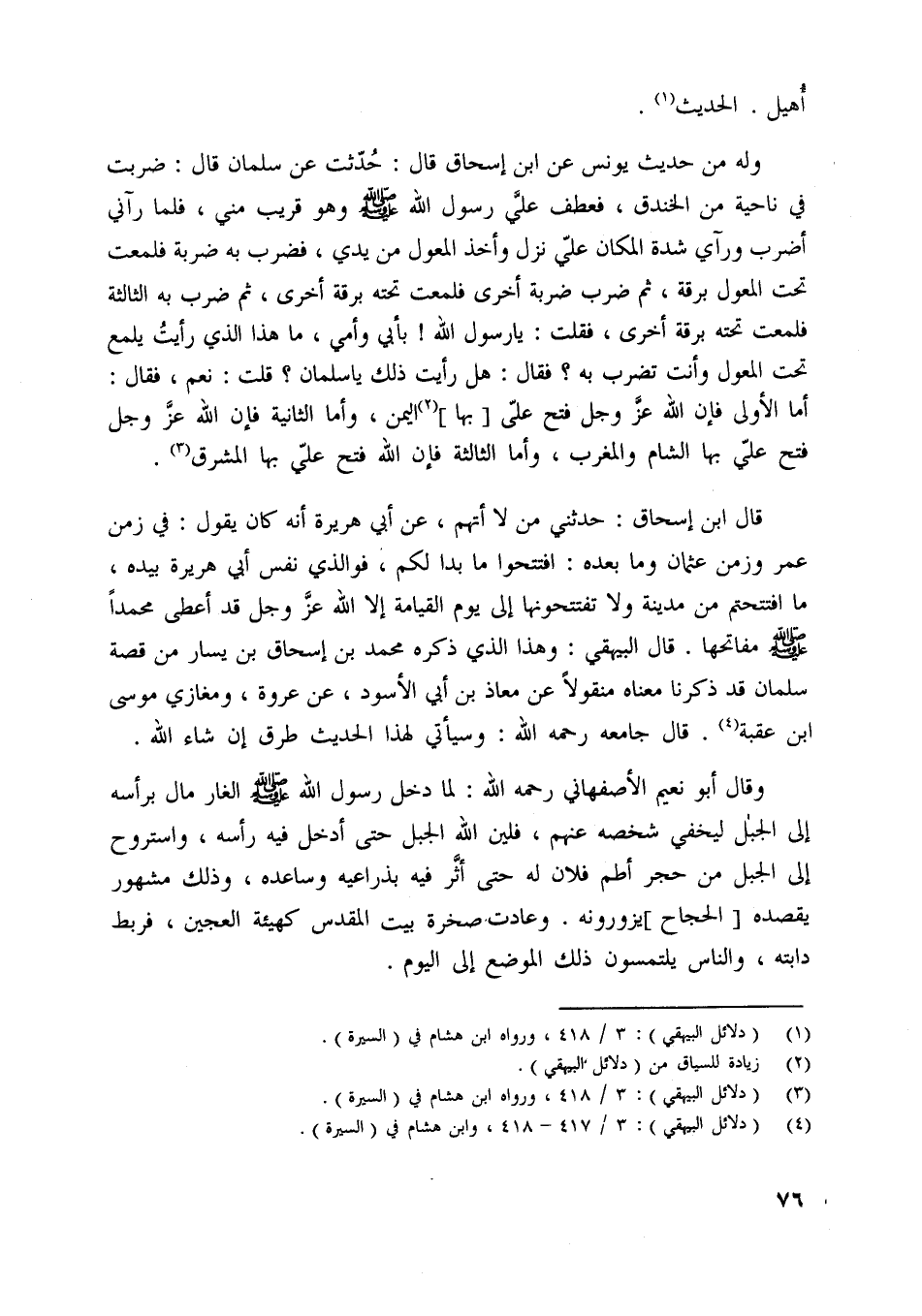 قال ابن إسحاق: حدثني من لا أتهم، عن أبي هريرة أنه كان يقول: في زمن عمر وزمن عثمان وما بعده: افتتحوا ما بدا لكم، فو الّذي نفس أبي هريرة بيده، ما افتتحتم من مدينة ولا تفتتحونها إلى يوم القيامة إلا اللَّه عزّ وجل قد أعطى محمدا صلّى اللَّه عليه وسلم مفاتحها. قال البيهقي: وهذا الّذي ذكره محمد بن إسحاق بن يسار من قصة سلمان قد ذكرنا معناه منقولا عن معاذ بن أبي الأسود، عن عروة، ومغازي موسى ابن عقبة [ (4) ] . قال جامعه رحمه اللَّه: وسيأتي لهذا الحديث طرق إن شاء اللَّه.