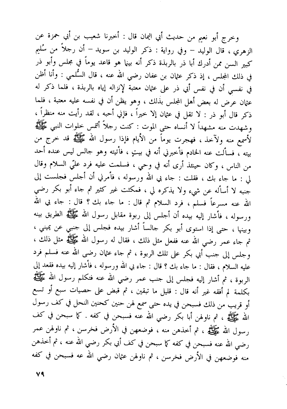 وخرج أبو نعيم من حديث أبي اليمان قال: أخبرنا شعيب بن أبي حمزة عن الزهري، قال الوليد- وفي رواية: ذكر الوليد بن سويد- أن رجلا من سليم كبير السن ممن أدرك أبا ذر بالربذة ذكر أنه بينما هو قاعد يوما في مجلس وأبو ذر في ذلك المجلس، إذ ذكر عثمان بن عفان رضي اللَّه عنه، قال السّلمي: وأنا أظن في نفسي أن في نفس أبي ذر على عثمان معتبة لإنزاله إياه بالربذة، فلما ذكر له عثمان عرض له بعض أهل المجلس بذلك، وهو يظن أن في نفسه عليه معتبة، فلما ذكر قال أبو ذر: لا تقل في عثمان إلا خيرا، فإنّي أحبه، لقد رأيت منه منظرا، وشهدت منه مشهدا لا أنساه حتى الموت: كنت رجلا ألتمس خلوات النبي صلّى اللَّه عليه وسلم لأسمع منه ولآخذ، فهجرت يوما من الأيام فإذا رسول اللَّه صلّى اللَّه عليه وسلم قد خرج من بيته، فسألت عنه الخادم فأخبرني أنه في بيت، فأتيته وهو جالس ليس عنده أحد من الناس، وكان حينئذ أرى أنه في وحي، فسلمت عليه فردّ عليّ السلام وقال لي: ما جاء بك، فقلت: جاء بي اللَّه ورسوله، فأمرني أن أجلس فجلست إلى جنبه لا أسأله عن شيء ولا يذكره لي، فمكثت غير كثير ثم جاء أبو بكر رضي اللَّه عنه مسرعا فسلم، فرد السلام ثم قال: ما جاء بك؟ قال: جاء بي اللَّه ورسوله، فأشار إليه بيده أن أجلس إلى ربوة مقابل رسول اللَّه صلّى اللَّه عليه وسلم الطريق بينه وبينها، حتى إذا استوى أبو بكر جالسا أشار بيده فجلس إلى جنبي عن يميني، ثم جاء عمر رضي اللَّه عنه ففعل مثل ذلك، فقال له رسول اللَّه صلّى اللَّه عليه وسلم مثل ذلك، وجلس إلى جنب أبي بكر على تلك الربوة، ثم جاء عثمان رضي اللَّه عنه فسلم فرد عليه السلام، فقال: ما جاء بك؟ قال: جاء بي اللَّه ورسوله، فأشار إليه بيده فقعد إلى الربوة، ثم أشار إليه فجلس إلى جنب عمر رضي اللَّه عنه فتكلم رسول اللَّه صلّى اللَّه عليه وسلم بكلمة لم أفقه غير أنه قال: قليل ما تبقين، ثم قبض على حصيات سبع أو تسع أو قريب من ذلك فسبحن في يده حتى سمع لهن حنين كحنين النحل في كف رسول اللَّه صلّى اللَّه عليه وسلم، ثم ناولهن أبا بكر رضي اللَّه عنه فسبحن في كفه. كما سبحن في كف رسول اللَّه صلّى اللَّه عليه وسلم، ثم أخذهن منه، فوضعهن في الأرض فخرسن، ثم ناولهن عمر رضي اللَّه عنه فسبحن في كفه كما سبحن في كف أبي بكر رضي اللَّه عنه، ثم أخذهن منه فوضعهن في الأرض فخرسن، ثم ناولهن عثمان رضي اللَّه عنه فسبحن في كفه