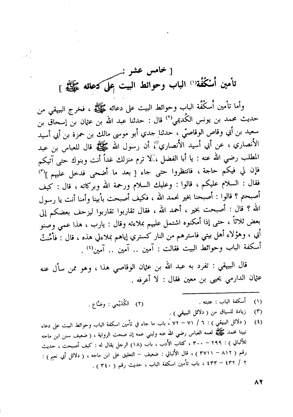 [ (4) ] (دلائل البيهقي) : 6/ 71- 72، باب ما جاء في تأمين اسكفة الباب وحوائط البيت على دعاء نبينا محمد صلّى اللَّه عليه وسلم لعمه العباس رضي اللَّه عنه ولبني عمه إن صحت الرواية، (ضعيف سنن ابن ماجة للألباني) : 299- 300، كتاب الأدب، باب (18) الرجل يقال له: كيف أصبحت، حديث رقم (812- 3711) ، قال الألباني: ضعيف- التعليق على ابن ماجة، (دلائل أبي نعيم) :