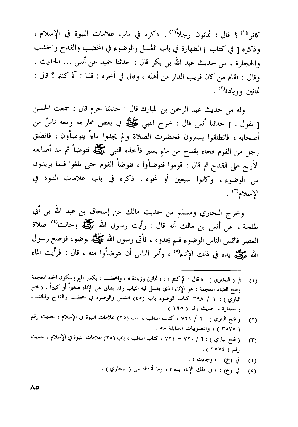 كانوا [ (1) ] ؟ قال: ثمانون رجلا [ (1) ] . ذكره في باب علامات النبوة في الإسلام، وذكره [في كتاب] الطهارة في باب الغسل والوضوء في المخضب والقدح والخشب والحجارة، من حديث عبد اللَّه بن بكر قال: حدثنا حميد عن أنس ... الحديث، وقال: فقام من كان قريب الدار من أهله، وقال في آخره: قلنا: كم كنتم؟ قال:
