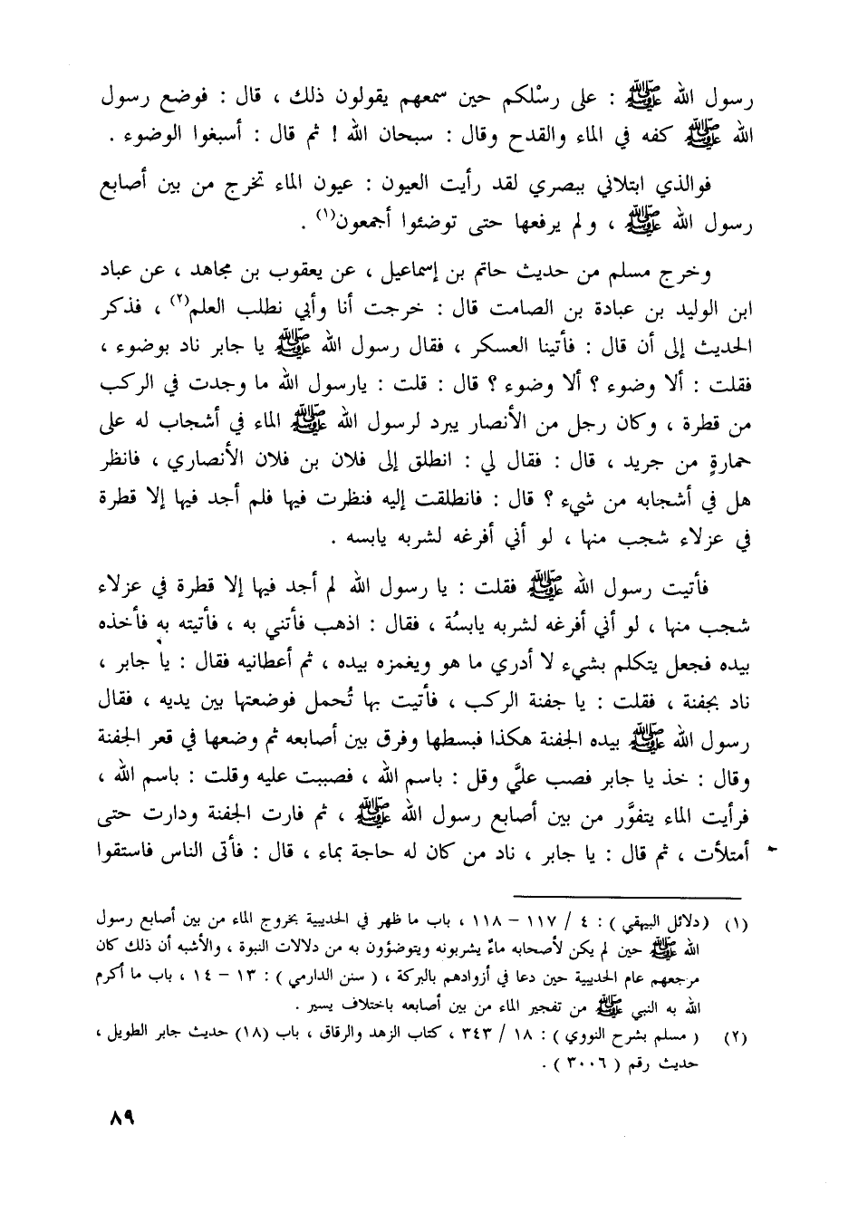 [ (1) ] (دلائل البيهقي) : 4/ 117- 118، باب ما ظهر في الحديبيّة بخروج الماء من بين أصابع رسول اللَّه صلّى اللَّه عليه وسلم حين لم يكن لأصحابه ماء يشربونه ويتوضئون به من دلالات النبوة، والأشبه أن ذلك كان مرجعهم عام الحديبيّة حين دعا في أزوادهم بالبركة، (سنن الدارميّ) : 13- 14، باب ما أكرم اللَّه به النبي صلّى اللَّه عليه وسلم من تفجير الماء من بين أصابعه باختلاف يسير.
