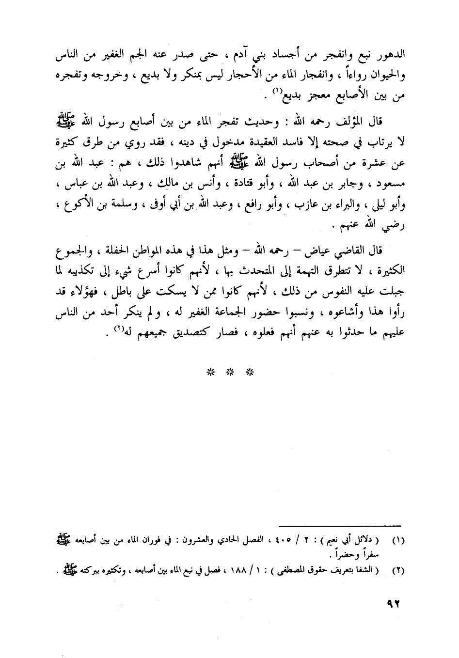 [ (2) ] (الشفا بتعريف حقوق المصطفى) : 1/ 188، فصل في نبع الماء بين أصابعه، وتكثيره ببركته صلّى اللَّه عليه وسلم.