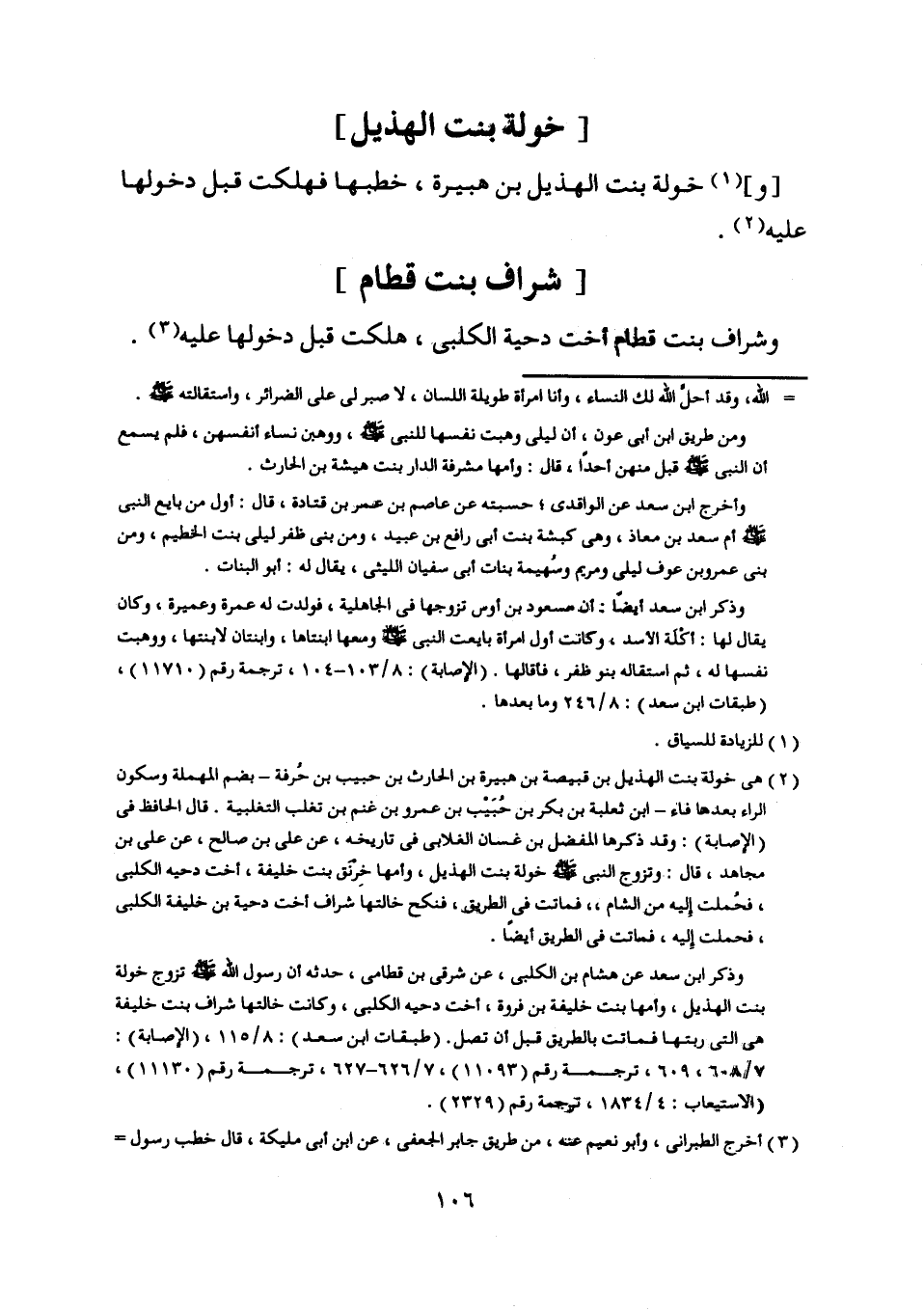 [ (2) ] هي خولة بنت الهذيل بن قبيصة بن هبيرة بن الحارث بن حبيب بن حرفة- بضم المهملة وسكون الراء بعدها فاء- ابن ثعلبة بن بكر بن حبيب بن عمرو بن غنم بن تغلب التغلبية. قال الحافظ في (الإصابة) : وقد ذكرها المفضل بن غسان الغلابي في تاريخه، عن على بن صالح، عن على بن مجاهد، قال: وتزوج النبي صلّى اللَّه عليه وسلم خولة بنت الهذيل، وأمها خرنق بنت خليفة، أخت دحية الكلبي.