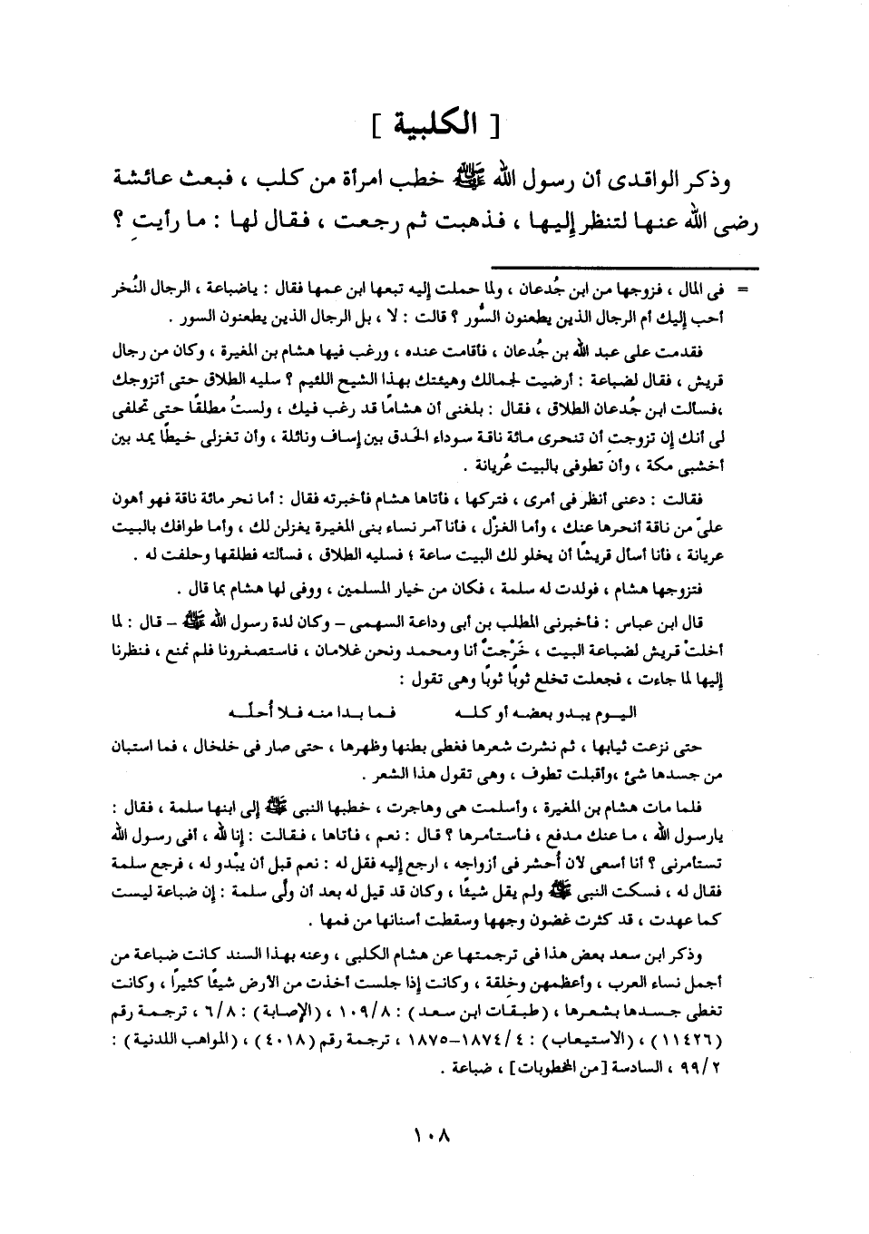 وذكر ابن سعد بعض هذا في ترجمتها عن هشام الكلبي، وعنه بهذا السند كانت ضباعة من أجمل نساء العرب، وأعظمهن وخلقة، وكانت إذا جلست أخذت من الأرض شيئا كثيرا، وكانت تغطى جسدها بشعرها، (طبقات ابن سعد) : 8/ 109، (الإصابة) : 8/ 6، ترجمة رقم (11426) ، (الاستيعاب) : 4/ 1874- 1875، ترجمة رقم (4018) ، (المواهب اللدنية) :