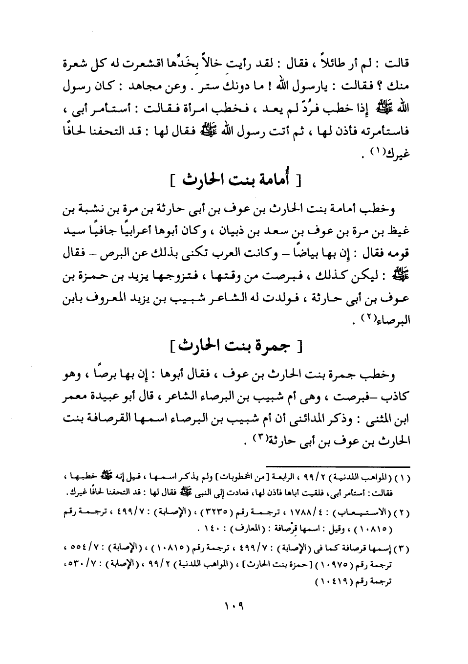[ (3) ] اسمها قرصافة كما في (الإصابة) : 7/ 499، ترجمة رقم (10815) ، (الإصابة) : 7/ 554، ترجمة رقم (10975) [جمرة بنت الحارث] ، (المواهب اللدنية) 2/ 99، (الإصابة) : 7/ 530، ترجمة رقم (10419) .