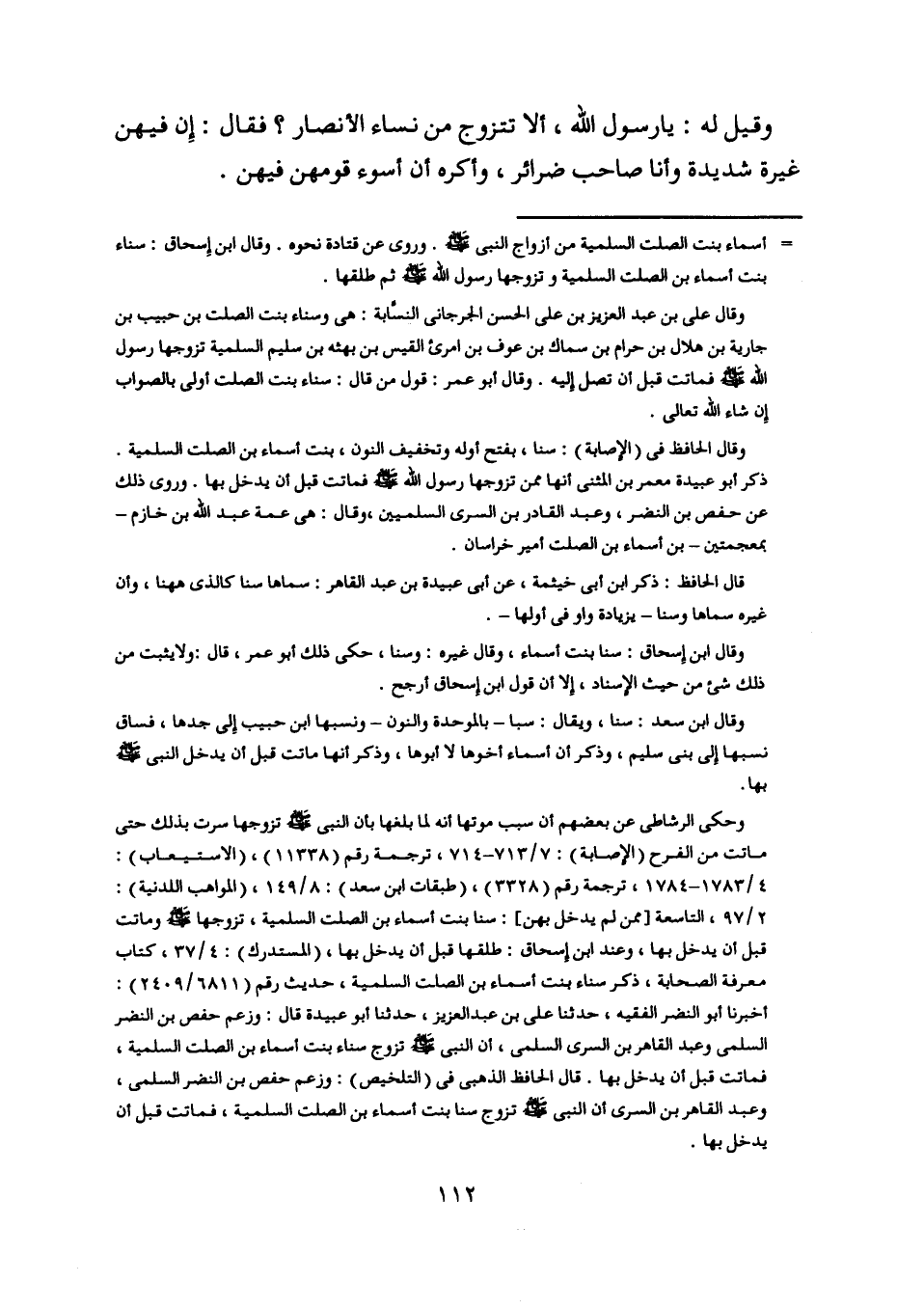 أخبرنا أبو النضر الفقيه، حدثنا على بن عبد العزيز، حدثنا أبو عبيدة قال: وزعم حفص بن النضر السلمي وعبد القاهر بن السري السلمي، أن النبي صلّى اللَّه عليه وسلم تزوج سناء بنت أسماء بن الصلت السلمية، فماتت قبل أن يدخل بها. قال الحافظ الذهبي في (التلخيص) : وزعم حفص بن النضر السلمي، وعبد القاهر بن السري أن النبي صلّى اللَّه عليه وسلم تزوج سنا بنت أسماء بنت الصلت السلمية، فماتت قبل أن يدخل بها.