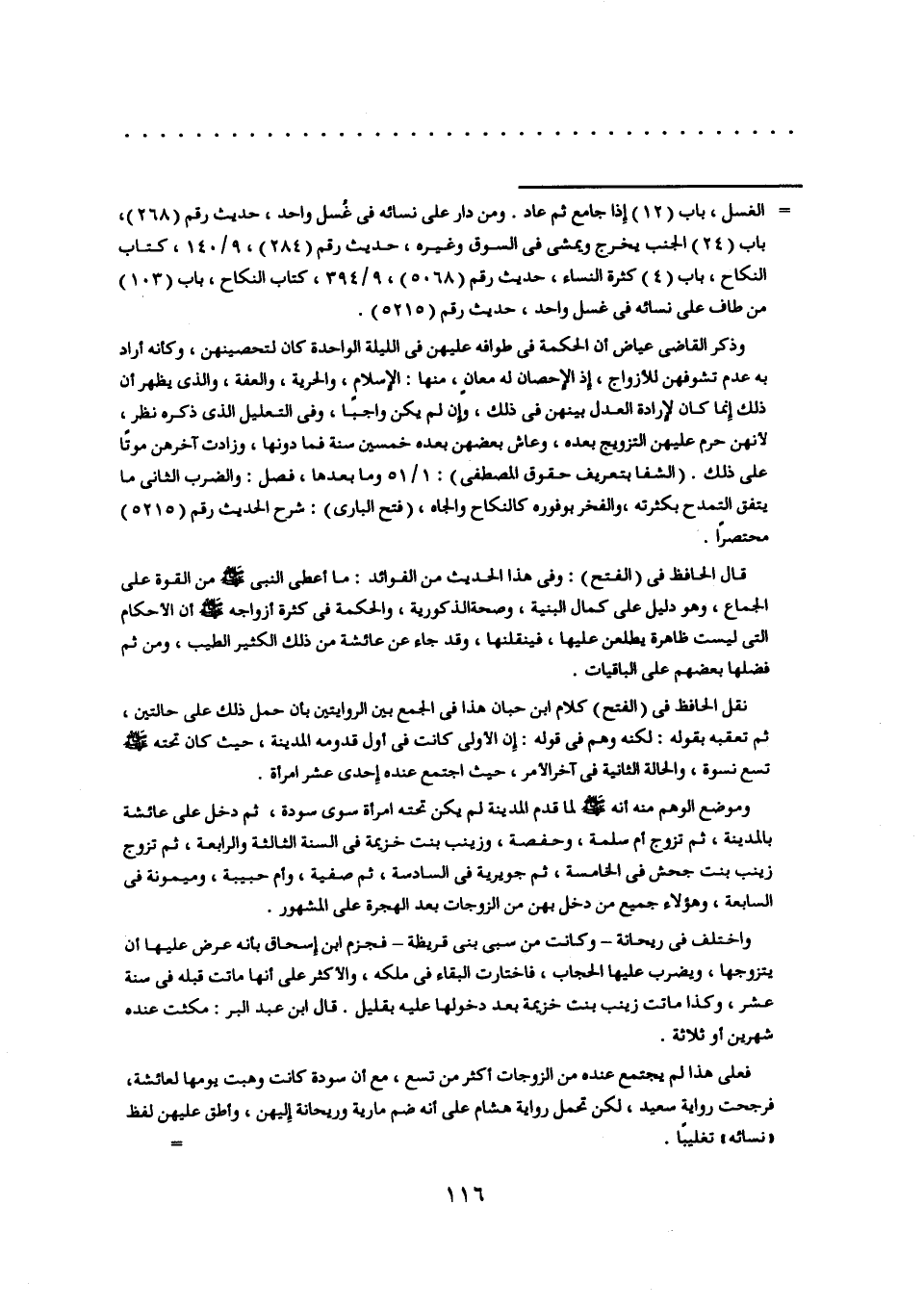 وذكر القاضي عياض أن الحكمة في طوافه عليهنّ في الليلة الواحدة كان لتحصينهن، وكأنه أراد به عدم تشوفهن للأزواج، إذ الإحصان له معان، منها: الإسلام، والحرية، والعفة، والّذي يظهر أن ذلك إنما كان لإرادة العدل بينهن في ذلك، وإن لم يكن واجبا، وفي التعليل الّذي ذكره نظر، لأنهن حرم عليهنّ التزويج بعده، وعاش بعضهن بعده خمسين سنة فما دونها، وزادت آخرهن موتا على ذلك. (الشفا بتعريف حقوق المصطفى) : 1/ 51 وما بعدها، فصل: والضرب الثاني ما يتفق التمدح بكثرته، والفخر بوفوره كالنكاح والجاه، (فتح الباري) : شرح الحديث رقم (5215) مختصرا.