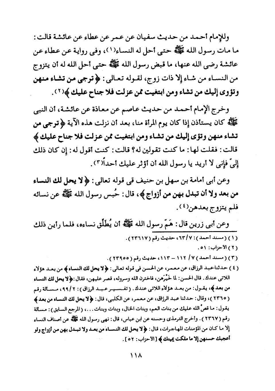 وخرج الإمام أحمد من حديث عاصم عن معاذة عن عائشة، أن النبي صلّى اللَّه عليه وسلم كان يستأذن إذا كان يوم المرأة منا، بعد أن نزلت هذه الآية تُرْجِي مَنْ تَشاءُ مِنْهُنَّ وَتُؤْوِي إِلَيْكَ مَنْ تَشاءُ وَمَنِ ابْتَغَيْتَ مِمَّنْ عَزَلْتَ فَلا جُناحَ عَلَيْكَ قالت: فقلت لها: ما كنت تقولين له؟ قالت: كنت أقول له: إن كان ذلك إليّ فإنّي لا أريد يا رسول اللَّه أن أؤثر عليك أحدا [ (3) ] .