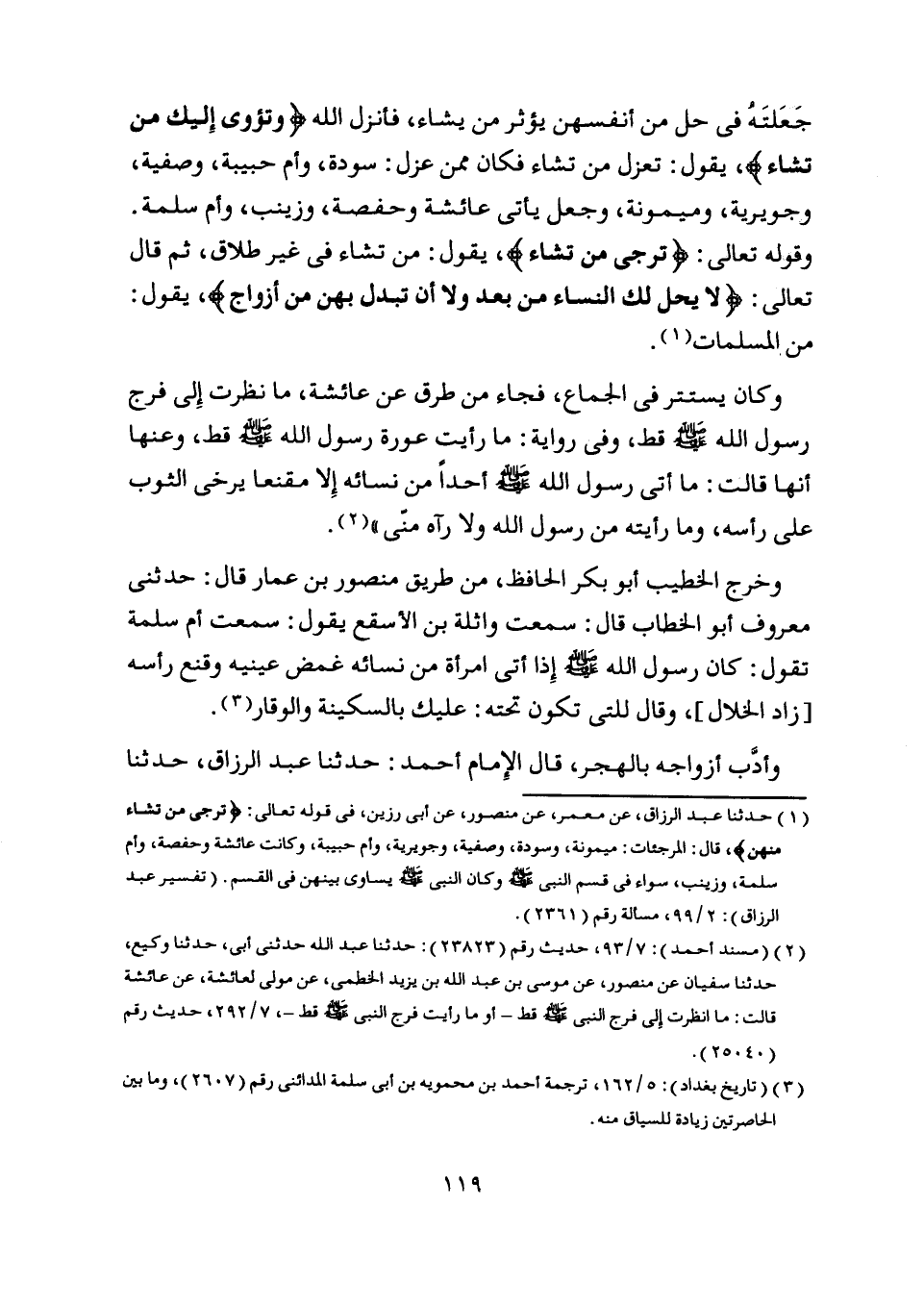 [ (1) ] حدثنا عبد الرزاق، عن معمر، عن منصور، عن أبى رزين، في قوله تعالى: تُرْجِي مَنْ تَشاءُ مِنْهُنَّ، قال: المرجئات: ميمونة، وسودة، وصفية، وجويرية، وأم حبيبة، وكانت عائشة وحفصة، وأم سلمة، وزينب، سواء في قسم النبي صلّى اللَّه عليه وسلم وكان النبي صلّى اللَّه عليه وسلم يساوى بينهن في القسم. (تفسير عبد الرزاق) : 2/ 99، مسألة رقم (2361) .