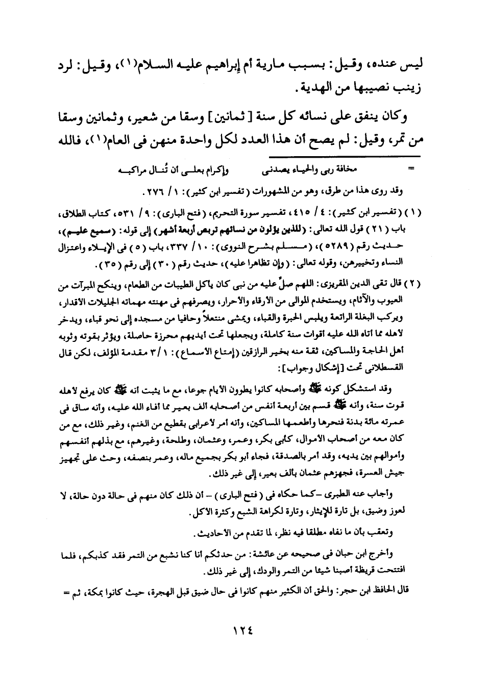 [ (2) ] قال تقى الدين المقريزي: اللَّهمّ صلّ عليه من نبي كان يأكل الطيبات من الطعام، وينكح المبرءات من العيوب والآثام، ويستخدم الموالي من الأرقاء والأحرار، ويصرفهم في مهنته مهماته الجليلات الأقدار، ويركب البغلة الراتعة ويلبس الحبرة والقباء، ويمشى منتعلا وحافيا من مسجده إلى نحو قباء، ويدخر لأهله مما أتاه اللَّه عليه أقوات سنة كاملة، ويجعلها تحت أيديهم محرزة حاصلة، ويؤثر بقوته وثوبه أهل الحاجة والمساكين، ثقة منه بخير الرازقين (إمتاع الأسماع) : 1/ 3 مقدمة المؤلف، لكن قال القسطلاني تحت [إشكال وجواب] :